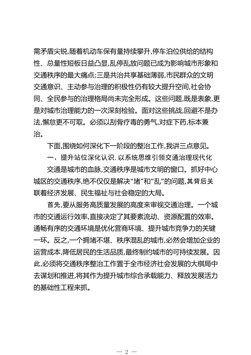 在XX市中心城區(qū)交通秩序整治工作調(diào)度會上的講話同志們:今天召開這次中心城區(qū)交通秩序整治工作調(diào)度會,主要任務(wù)是總結(jié)前一階段的工作成效,深入剖析當(dāng)前存在的突出問題與深層癥結(jié),并對下一階段的重點(diǎn)任務(wù)進(jìn)行全面部署,旨在以更堅(jiān)定的決心、更強(qiáng)大的合力、更務(wù)實(shí)的舉措,推動城區(qū)交通秩序治理工作向縱深發(fā)展,取得常態(tài)長效的扎實(shí)成果。剛才,大家共同觀看了中心城區(qū)交通秩序的暗訪短片,片中反映的問題觸目驚心、發(fā)人深省。相關(guān)部門也分別匯報了近期的工作進(jìn)展,講得都很好,既有成績的梳理,也有問題的反思??傮w來看,自整治工作啟動以來,在各單位的共同努力下,中心城區(qū)的交通環(huán)境...