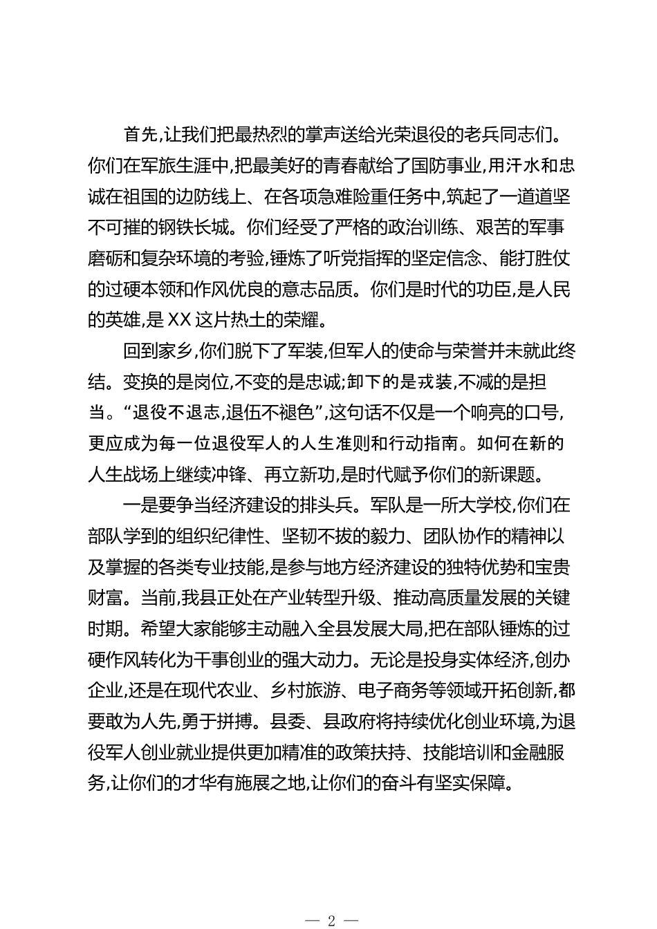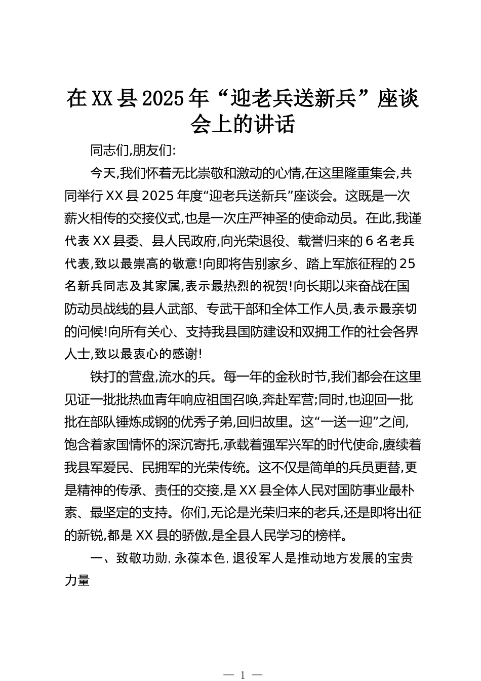 在XX縣2025年“迎老兵送新兵”座談會上的講話同志們,朋友們:今天,我們懷著無比崇敬和激動的心情,在這里隆重集會,共同舉行XX縣2025“”年度迎老兵送新兵座談會。這既是一次薪火相傳的交接儀式,也是一次莊嚴神圣的使命動員。在此,我謹代表XX縣委、縣人民政府,向光榮退役、載譽歸來的6名老兵代表,致以最崇高的敬意!向即將告別家鄉(xiāng)、踏上軍旅征程的25名新兵同志及其家屬,表示最熱烈的祝賀!向長期以來奮戰(zhàn)在國防動員戰(zhàn)線的縣人武部、專武干部和全體工作人員,表示最切親的問候!向所有關(guān)心、支持我縣國防建設(shè)和雙擁工作的社會各界人士,致以最衷心的感謝!鐵打的營盤,流水的兵。每...