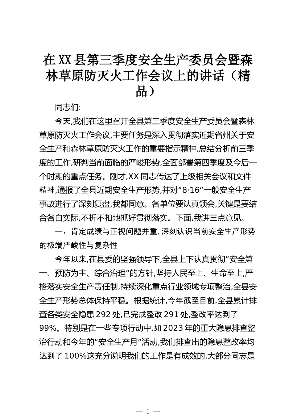 在XX縣第三季度安全生產(chǎn)委員會(huì)暨森林草原防滅火工作會(huì)議上的講話(huà)(精品)