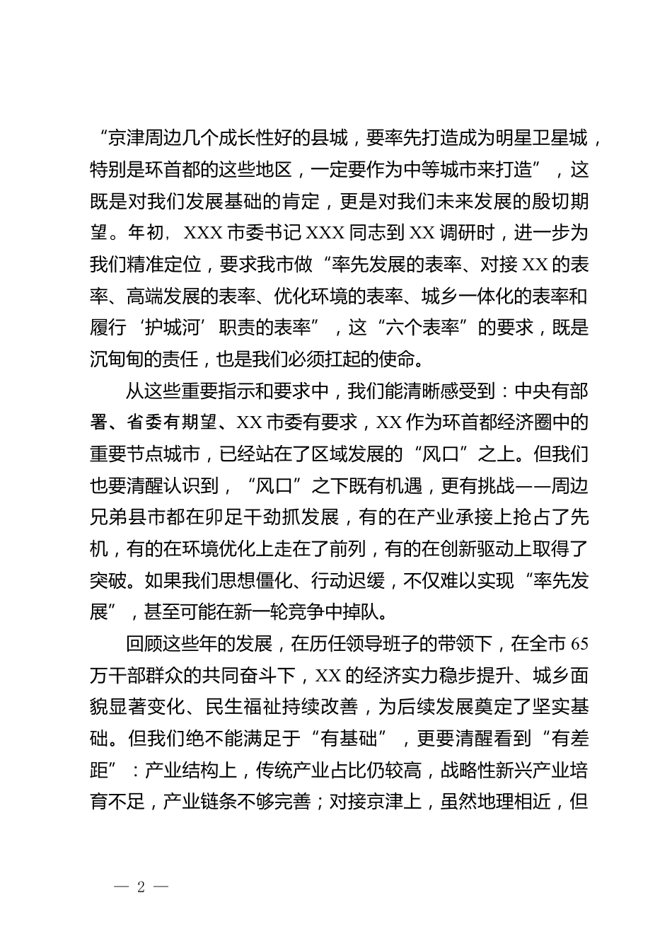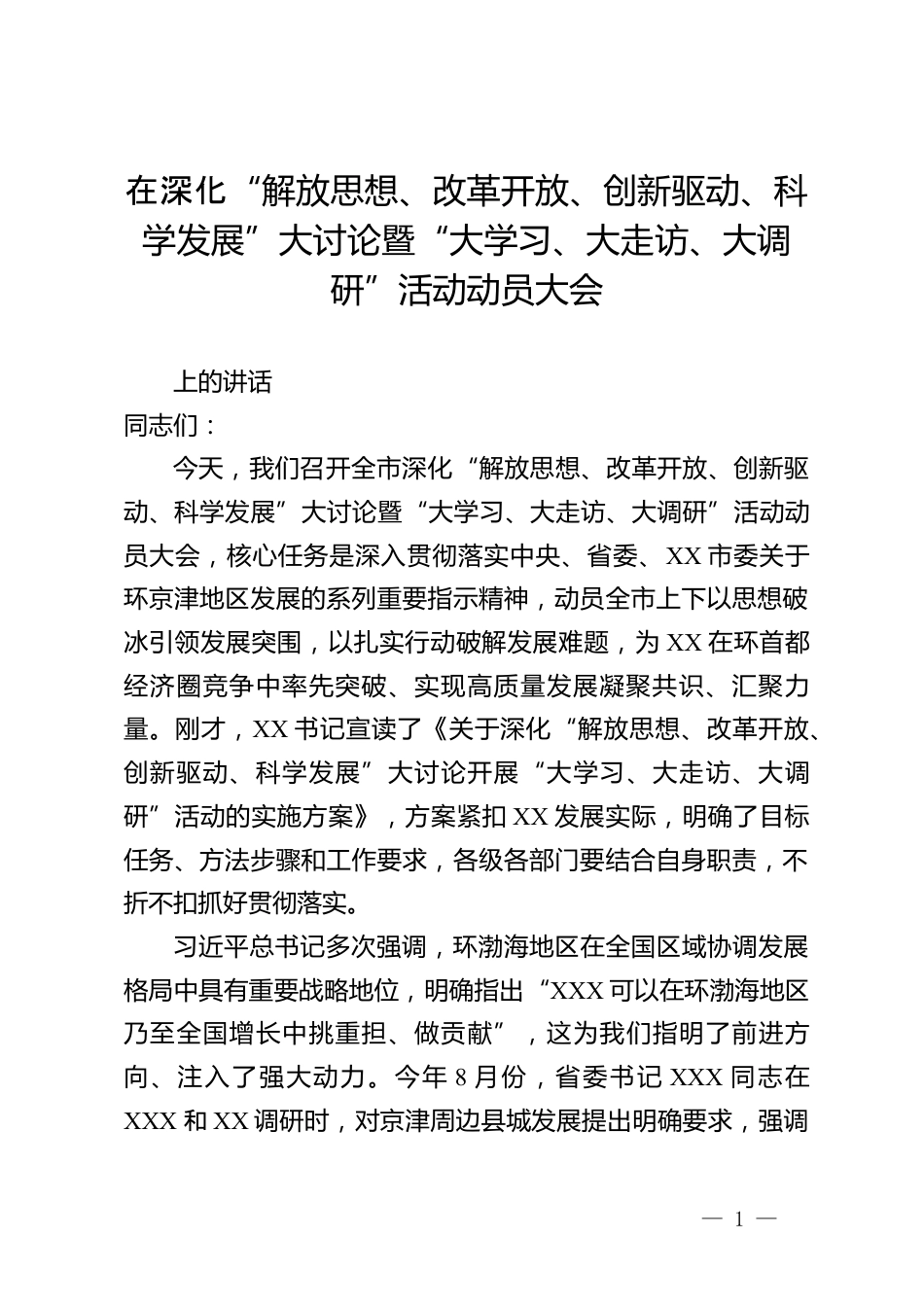 在深化“解放思想、改革開放、創(chuàng)新驅(qū)動、科學(xué)發(fā)展”大討論暨“大學(xué)習(xí)、大走訪、大調(diào)研”活動動員大會上的講話同志們:今天,我們召開全市深化“解放思想、改革開放、創(chuàng)新驅(qū)動、科學(xué)發(fā)展”大討論暨“大學(xué)習(xí)、大走訪、大調(diào)研”活動動員大會,核心任務(wù)是深入貫徹落實中央、省委、XX市委關(guān)于環(huán)京津地區(qū)發(fā)展的系列重要指示精神,動員全市上下以思想破冰引領(lǐng)發(fā)展突圍,以扎實行動破解發(fā)展難題,為XX在環(huán)首都經(jīng)濟圈競爭中率先突破、實現(xiàn)高質(zhì)量發(fā)展凝聚共識、匯聚力量。剛才,XX書記宣讀了《關(guān)于深化“解放思想、改革開放、創(chuàng)新驅(qū)動、科學(xué)發(fā)展”大討論開展“大學(xué)習(xí)、大走訪、大調(diào)...