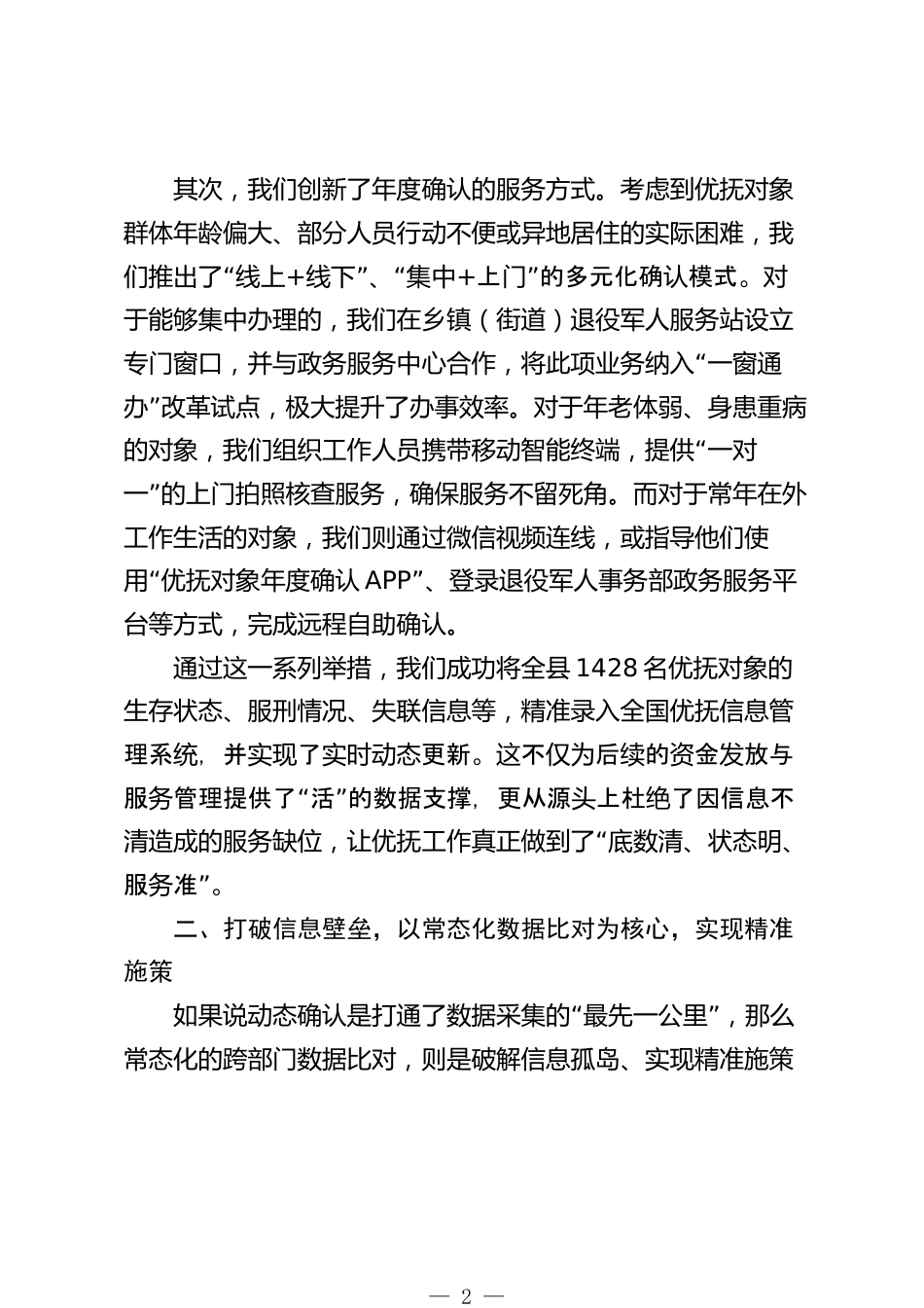 在市退役軍人事務工作會議上的經(jīng)驗匯報尊敬的各位領導、同志們:大家上午好!非常榮幸能在此次會議上,代表XX縣就我縣近年來在優(yōu)撫工作提質增效方面的探索與實踐,向各位領導和同仁作簡要匯報。面對新時代退役軍人服務保障工作的新要求,我們始終堅持以服務對象為中心,聚焦精準化、規(guī)范化管理,著力構“”建四位一體工作新格局。下面,我將從四個方面展開匯報。一、夯實數(shù)據(jù)根基,以動態(tài)化年度確認為抓手,實現(xiàn)精準識別優(yōu)撫工作的精準度,源于對服務對象底數(shù)的精確掌握。我們深刻認識到,靜態(tài)、陳舊的數(shù)據(jù)是工作低效乃至出錯的根“”源。為此,我們徹底改變了以往一次采...