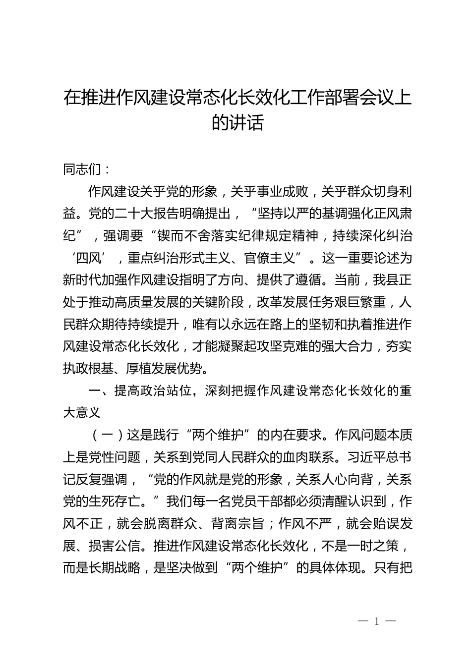 在推進作風(fēng)建設(shè)常態(tài)化長效化工作部署會議上的講話同志們:作風(fēng)建設(shè)關(guān)乎黨的形象,關(guān)乎事業(yè)成敗,關(guān)乎群眾切身利益。黨的二十大報告明確提出,“堅持以嚴(yán)的基調(diào)強化正風(fēng)肅紀(jì)”,強調(diào)要“鍥而不舍落實紀(jì)律規(guī)定精神,持續(xù)深化糾治‘四風(fēng)’,重點糾治形式主義、官僚主義”。這一重要論述為新時代加強作風(fēng)建設(shè)指明了方向、提供了遵循。當(dāng)前,我縣正處于推動高質(zhì)量發(fā)展的關(guān)鍵階段,改革發(fā)展任務(wù)艱巨繁重,人民群眾期待持續(xù)提升,唯有以永遠(yuǎn)在路上的堅韌和執(zhí)著推進作風(fēng)建設(shè)常態(tài)化長效化,才能凝聚起攻堅克難的強大合力,夯實執(zhí)政根基、厚植發(fā)展優(yōu)勢。一、提高政治站位,深刻把握...