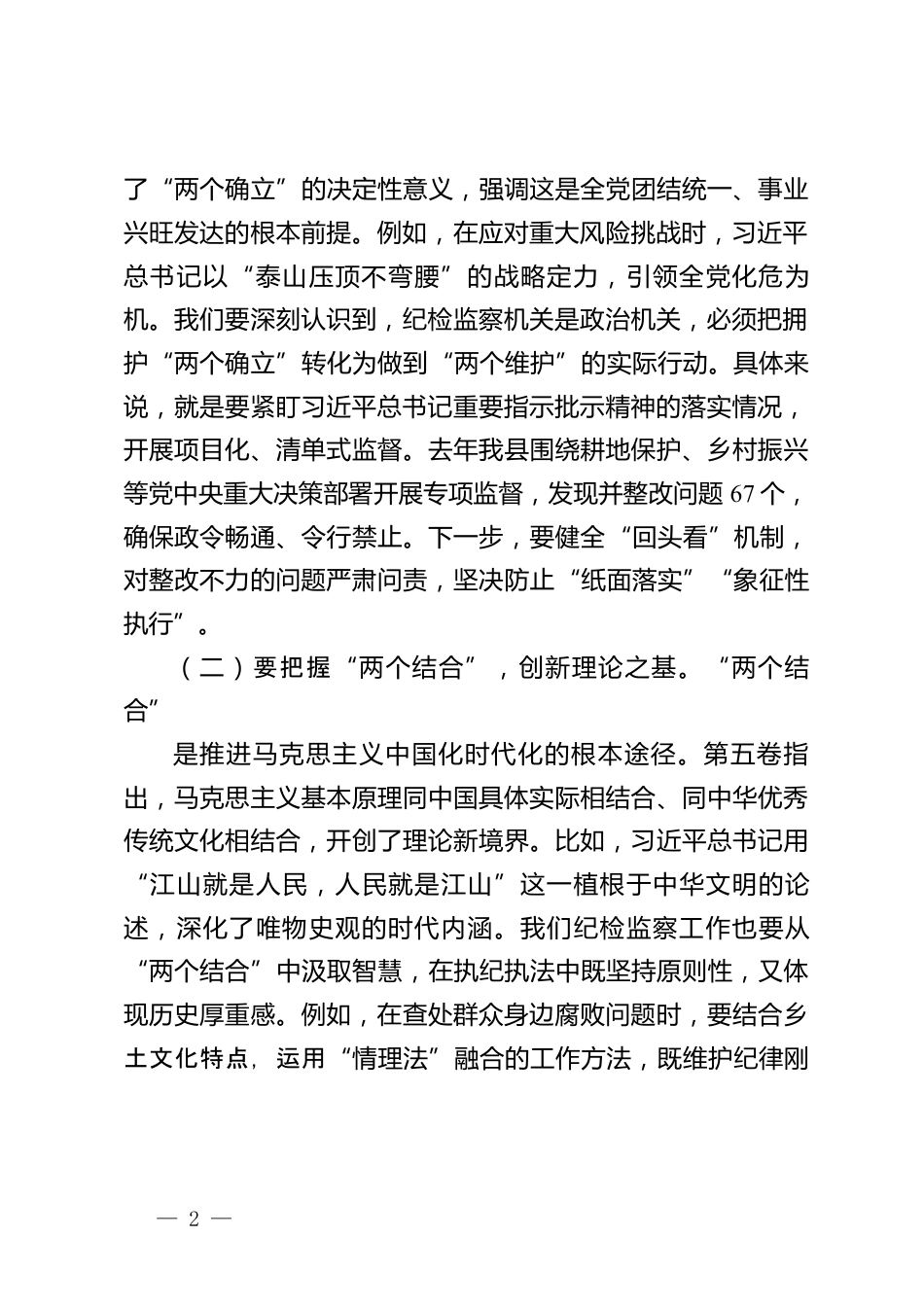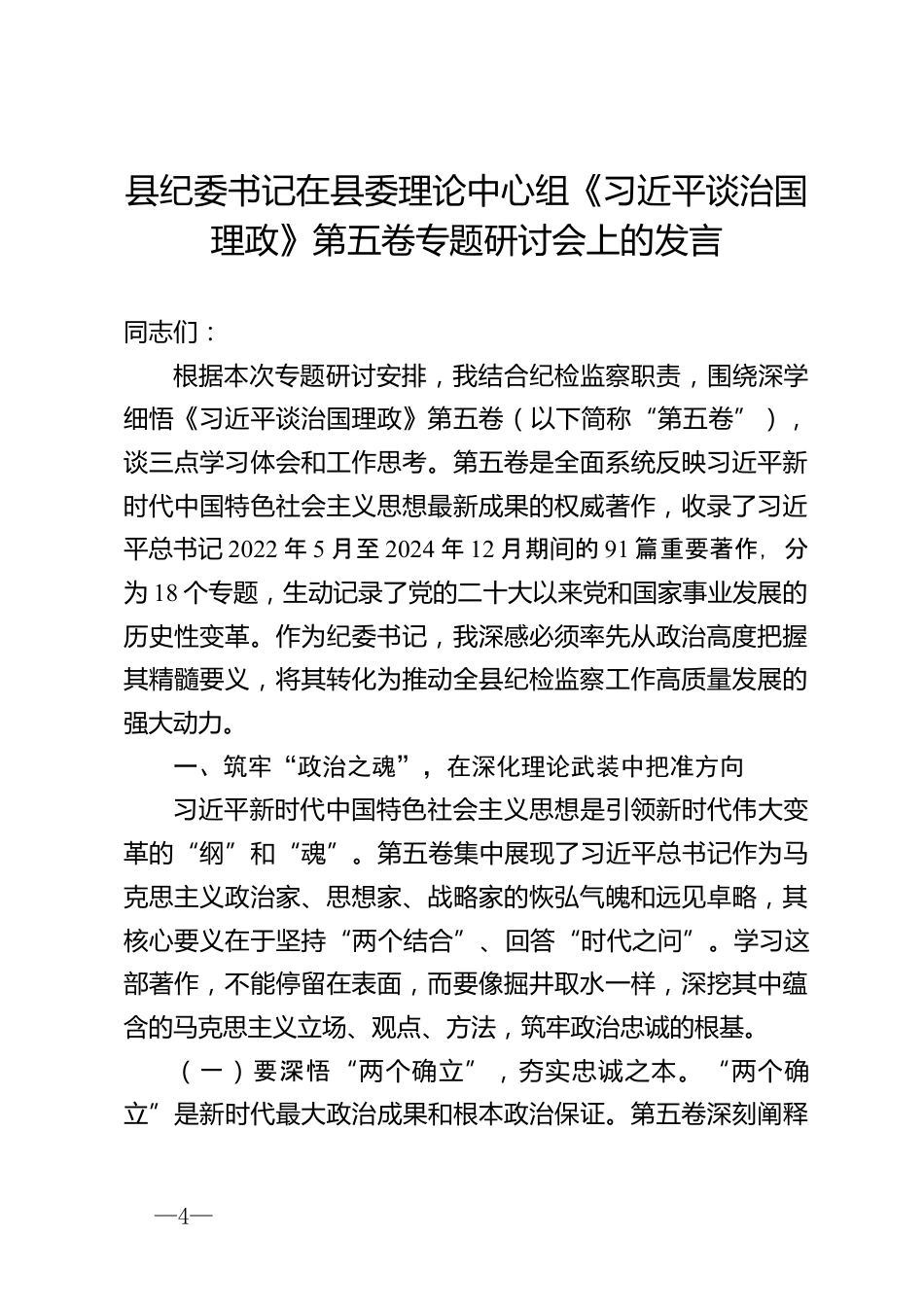 縣紀(jì)委書(shū)記在縣委理論中心組《習(xí)近平談治國(guó)理政》第五卷專題研討會(huì)上的發(fā)言同志們:根據(jù)本次專題研討安排,我結(jié)合紀(jì)檢監(jiān)察職責(zé),圍繞深學(xué)細(xì)悟《習(xí)近平談治國(guó)理政》第五卷(以下簡(jiǎn)稱“第五卷”),談三點(diǎn)學(xué)習(xí)體會(huì)和工作思考。第五卷是全面系統(tǒng)反映習(xí)近平新時(shí)代中國(guó)特色社會(huì)主義思想最新成果的權(quán)威著作,收錄了習(xí)近平總書(shū)記2022年5月至2024年12月期間的91篇重要著作,分為18個(gè)專題,生動(dòng)記錄了黨的二十大以來(lái)黨和國(guó)家事業(yè)發(fā)展的歷史性變革。作為紀(jì)委書(shū)記,我深感必須率先從政治高度把握其精髓要義,將其轉(zhuǎn)化為推動(dòng)全縣紀(jì)檢監(jiān)察工作高質(zhì)量發(fā)展的強(qiáng)大動(dòng)力。一、筑牢“政治之...