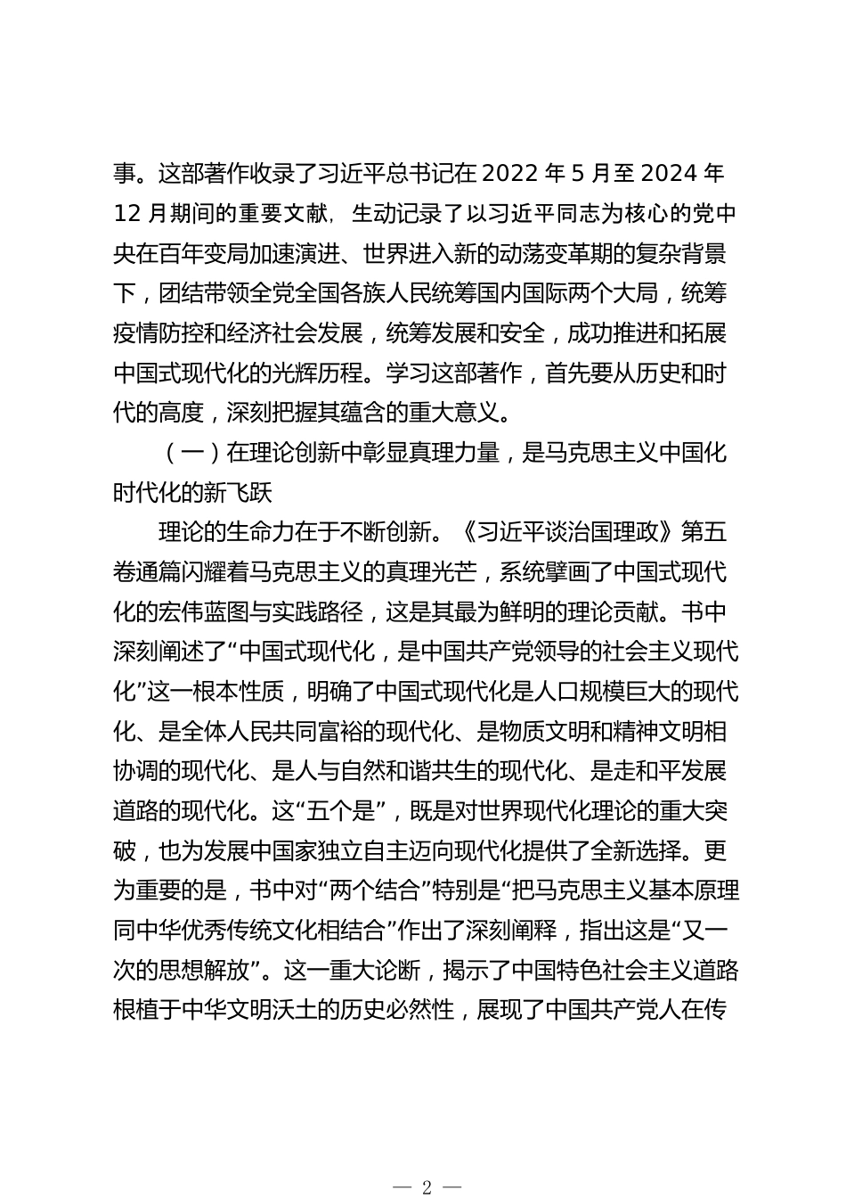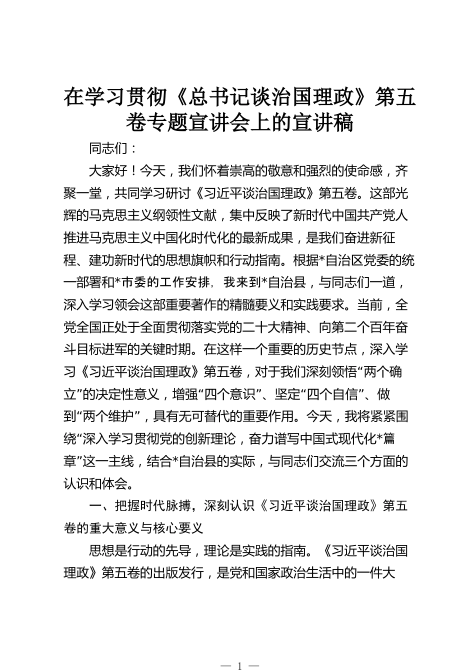 在學(xué)習(xí)貫徹《總書記談治國理政》第五卷專題宣講會上的宣講稿同志們:大家好!今天,我們懷著崇高的敬意和強烈的使命感,齊聚一堂,共同學(xué)習(xí)研討《習(xí)近平談治國理政》第五卷。這部光輝的馬克思主義綱領(lǐng)性文獻,集中反映了新時代中國共產(chǎn)黨人推進馬克思主義中國化時代化的最新成果,是我們奮進新征程、建功新時代的思想旗幟和行動指南。根據(jù)*自治區(qū)黨委的統(tǒng)一部署和*市委的工作安排,我來到*自治縣,與同志們一道,深入學(xué)習(xí)領(lǐng)會這部重要著作的精髓要義和實踐要求。當(dāng)前,全黨全國正處于全面貫徹落實黨的二十大精神、向第二個百年奮斗目標進軍的關(guān)鍵時期。在這樣一個重要的...