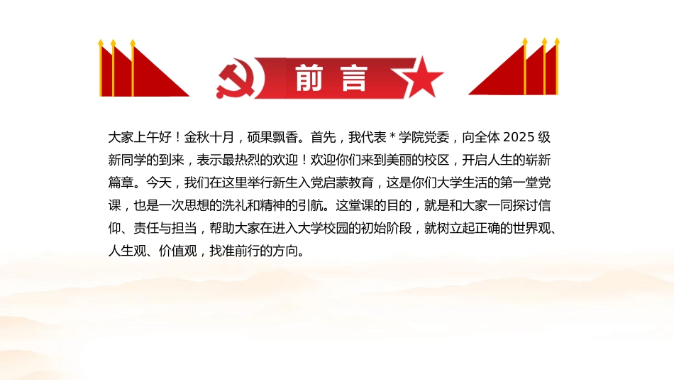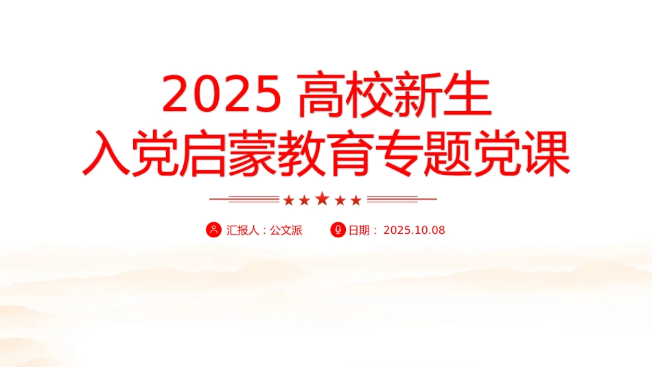 2025高校新生入黨啟蒙教育專題黨課日期:2025.10.08匯報(bào)人:公文派前言大家上午好!金秋十月,碩果飄香。首先,我代表*學(xué)院黨委,向全體2025級(jí)新同學(xué)的到來,表示最熱烈的歡迎!歡迎你們來到美麗的校區(qū),開啟人生的嶄新篇章。今天,我們在這里舉行新生入黨啟蒙教育,這是你們大學(xué)生活的第一堂黨課,也是一次思想的洗禮和精神的引航。這堂課的目的,就是和大家一同探討信仰、責(zé)任與擔(dān)當(dāng),幫助大家在進(jìn)入大學(xué)校園的初始階段,就樹立起正確的世界觀、人生觀、價(jià)值觀,找準(zhǔn)前行的方向。前言今天,我將圍繞三個(gè)核心問題與大家進(jìn)行交流:第一,作為新時(shí)代的大學(xué)生,我們?yōu)槭裁?..