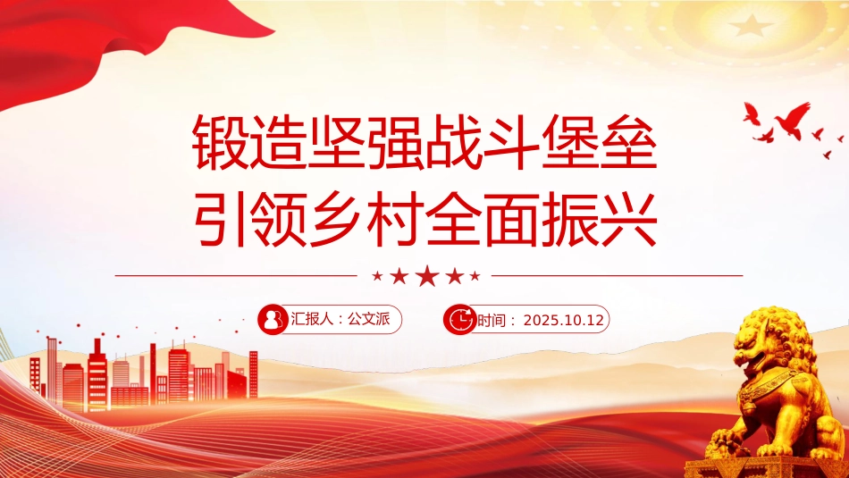 鍛造堅強戰(zhàn)斗堡壘引領(lǐng)鄉(xiāng)村全面振興匯報人:公文派時間:2025.10.12前言導(dǎo)讀今天,我們齊聚在*村,召開這次專題黨課,主要目的就是圍繞軟弱渙散基層黨組織整頓提升這一重要課題,與大家進行一次深入的交流和探討。這項工作,是黨中央著眼于夯實黨的執(zhí)政根基、推進國家治理體系和治理能力現(xiàn)代化作出的重大部署,也是我們推動鄉(xiāng)村全面振興、實現(xiàn)高質(zhì)量發(fā)展的必然要求。剛才,我看到了村容村貌的新變化,也感受到了大家干事創(chuàng)業(yè)的熱情,這很好。但我們更要清醒地認識到,基礎(chǔ)不牢,地動山搖。*村黨組織被列為整頓對象,這既是壓力,更是動力。希望通過今天的黨課,我們能夠統(tǒng)...