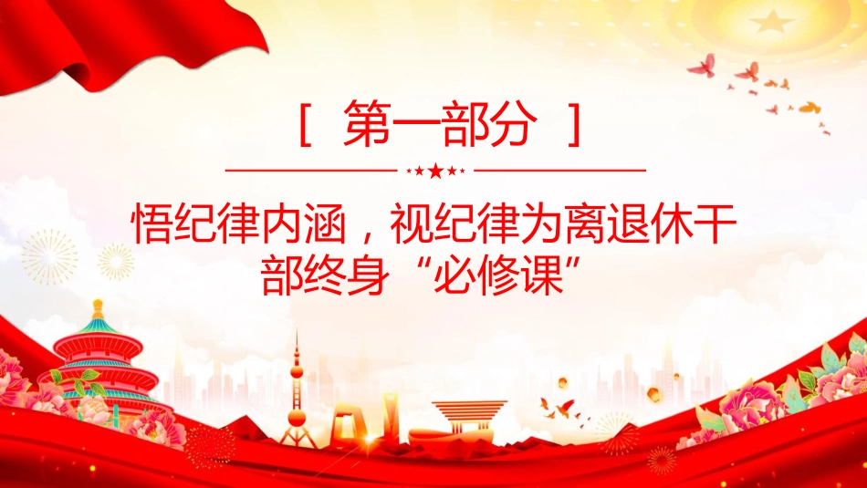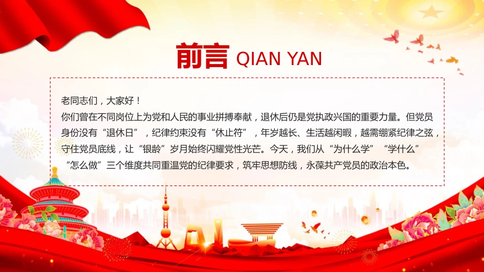 筑思想防線葆黨員本色——離退休老干部專題黨課——授課人:某某某時間:2025.10.13前言QIANYAN老同志們,大家好!你們曾在不同崗位上為黨和人民的事業(yè)拼搏奉獻(xiàn),退休后仍是黨執(zhí)政興國的重要力量。但黨員身份沒有“退休日”,紀(jì)律約束沒有“休止符”,年歲越長、生活越閑暇,越需繃緊紀(jì)律之弦,守住黨員底線,讓“銀齡”歲月始終閃耀黨性光芒。今天,我們從“為什么學(xué)”“學(xué)什么”“怎么做”三個維度共同重溫黨的紀(jì)律要求,筑牢思想防線,永葆共產(chǎn)黨員的政治本色。悟紀(jì)律內(nèi)涵,視紀(jì)律為離退休干部終身“必修課”[第一部分]悟紀(jì)律內(nèi)涵,視紀(jì)律為離退休干部終身“必修課”...