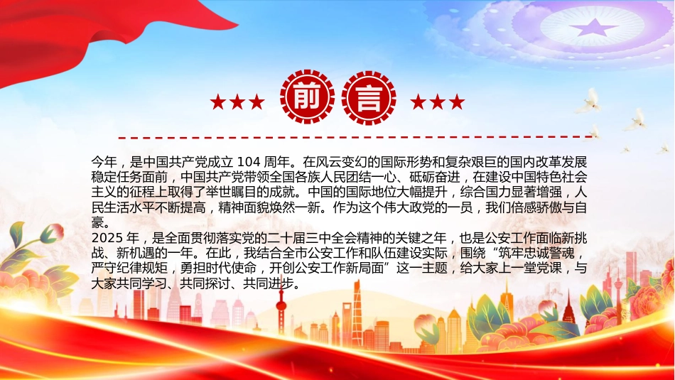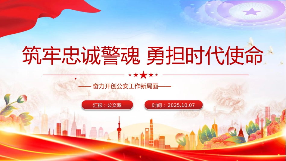 筑牢忠誠警魂勇?lián)鷷r代使命匯報:公文派時間:2025.10.07——奮力開創(chuàng)公安工作新局面——今年,是中國共產(chǎn)黨成立104周年。在風(fēng)云變幻的國際形勢和復(fù)雜艱巨的國內(nèi)改革發(fā)展穩(wěn)定任務(wù)面前,中國共產(chǎn)黨帶領(lǐng)全國各族人民團結(jié)一心、砥礪奮進,在建設(shè)中國特色社會主義的征程上取得了舉世矚目的成就。中國的國際地位大幅提升,綜合國力顯著增強,人民生活水平不斷提高,精神面貌煥然一新。作為這個偉大政黨的一員,我們倍感驕傲與自豪。2025年,是全面貫徹落實黨的二十屆三中全會精神的關(guān)鍵之年,也是公安工作面臨新挑戰(zhàn)、新機遇的一年。在此,我結(jié)合全市公安工作和隊伍建設(shè)實際,...