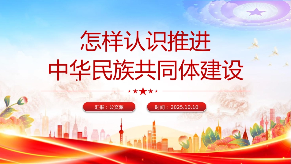 怎樣認(rèn)識推進(jìn)中華民族共同體建設(shè)匯報:公文派時間:2025.10.10中華民族具有百萬年的人類史、一萬年的文化史、五千多年的文明史。在漫長的歷史演進(jìn)中,我國各民族手足相親、守望相助,形成了血脈相融、骨肉相連,你中有我、我中有你,多元一體、不可分割的命運共同體。這是我國的一個顯著標(biāo)志,也是我國發(fā)展的巨大優(yōu)勢。前言黨的十八大以來,以習(xí)近平同志為核心的黨中央將民族工作提升到前所未有的高度,把鑄牢中華民族共同體意識確定為新時代黨的民族工作主線、民族地區(qū)各項工作的主線,召開兩次中央民族工作會議、三次全國民族團(tuán)結(jié)進(jìn)步表彰大會、第二次和第三次中央新疆...
