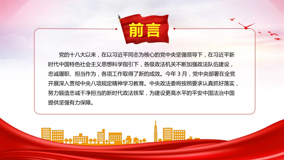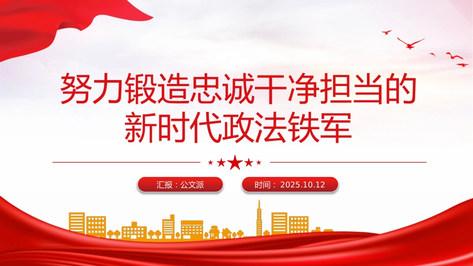 努力鍛造忠誠干凈擔當?shù)男聲r代政法鐵軍匯報:公文派時間:2025.10.12前言黨的十八大以來,在以習近平同志為核心的黨中央堅強領導下,在習近平新時代中國特色社會主義思想科學指引下,各級政法機關不斷加強政法隊伍建設,忠誠履職、擔當作為,各項工作取得了新的成效。今年3月,黨中央部署在全黨開展深入貫徹中央八項規(guī)定精神學習教育。中央政法委將按照要求認真抓好落實,努力鍛造忠誠干凈擔當?shù)男聲r代政法鐵軍,為建設更高水平的平安中國法治中國提供堅強有力保障。第一部分習近平總書記就加強政法隊伍建設作出的系列重要指示,為鍛造新時代政法鐵軍指明了方向習近平總...
