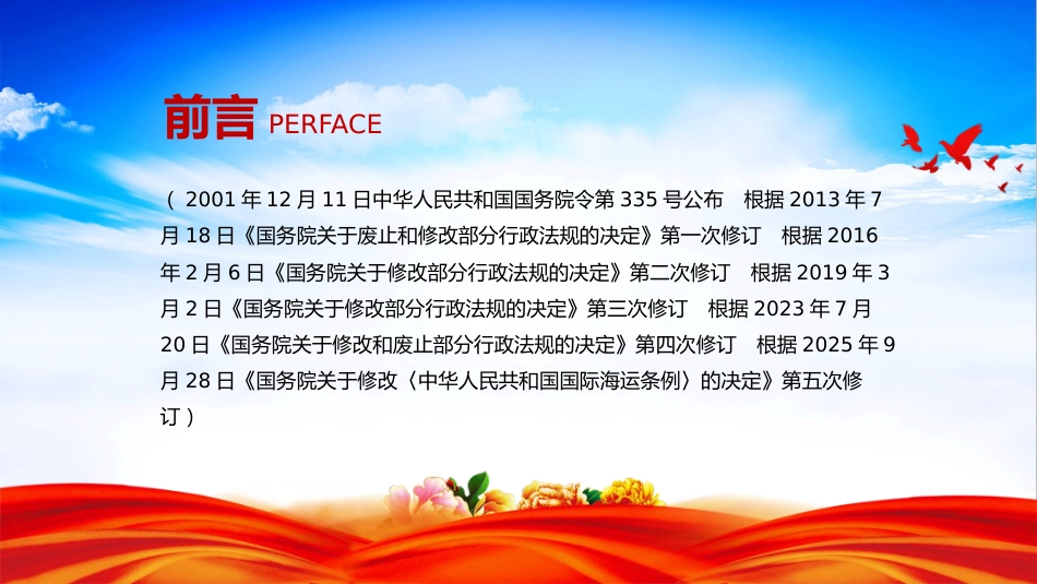 匯報人:某某某時間:2025.10.05中華人民共和國國際海運條例前言PERFACE(2001年12月11日中華人民共和國國務院令第335號公布根據(jù)2013年7月18日《國務院關于廢止和修改部分行政法規(guī)的決定》第一次修訂根據(jù)2016年2月6日《國務院關于修改部分行政法規(guī)的決定》第二次修訂根據(jù)2019年3月2日《國務院關于修改部分行政法規(guī)的決定》第三次修訂根據(jù)2023年7月20日《國務院關于修改和廢止部分行政法規(guī)的決定》第四次修訂根據(jù)2025年9月28日《國務院關于修改〈中華人民共和國國際海運條例〉的決定》第五次修訂)01PARTONE總則第一條?為了規(guī)范國際海上運輸活動,保護公平競爭,維護國際...
