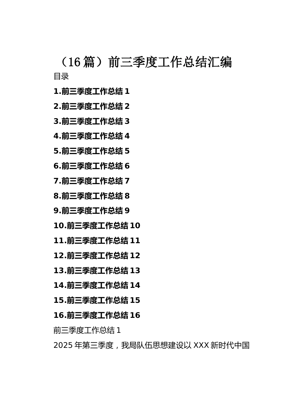 (16篇)前三季度工作總結(jié)匯編目錄1.前三季度工作總結(jié)12.前三季度工作總結(jié)23.前三季度工作總結(jié)34.前三季度工作總結(jié)45.前三季度工作總結(jié)56.前三季度工作總結(jié)67.前三季度工作總結(jié)78.前三季度工作總結(jié)89.前三季度工作總結(jié)910.前三季度工作總結(jié)1011.前三季度工作總結(jié)1112.前三季度工作總結(jié)1213.前三季度工作總結(jié)1314.前三季度工作總結(jié)1415.前三季度工作總結(jié)1516.前三季度工作總結(jié)16前三季度工作總結(jié)12025年第三季度,我局隊(duì)伍思想建設(shè)以XXX新時(shí)代中國(guó)特色社會(huì)主義思想為指引,持續(xù)鞏固黨史學(xué)習(xí)教育成果,深入推進(jìn)“鑄忠誠(chéng)、提能力、勇?lián)?dāng)、作示范”活動(dòng),全方位強(qiáng)化和改進(jìn)隊(duì)...