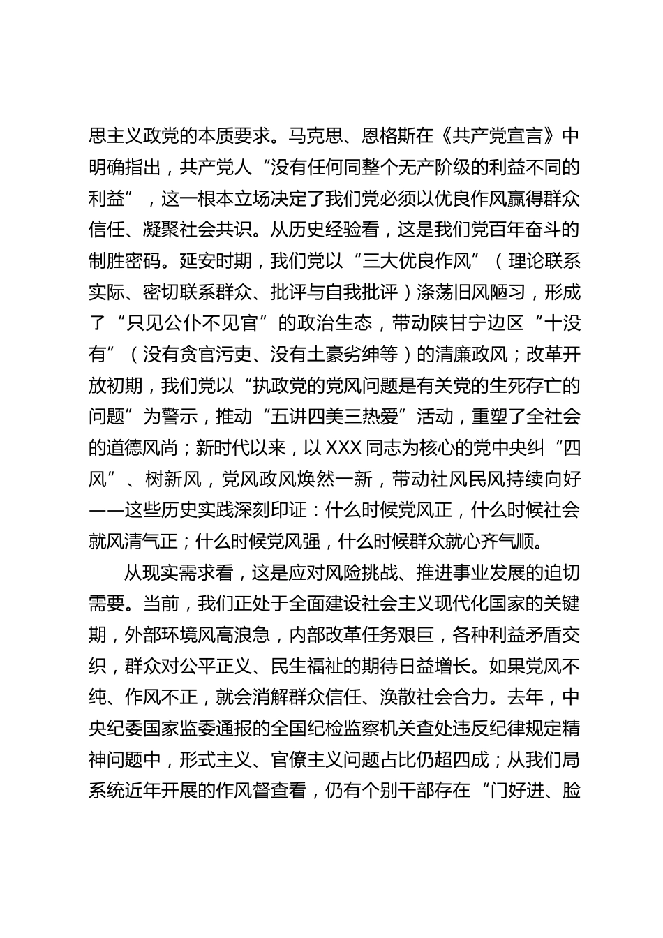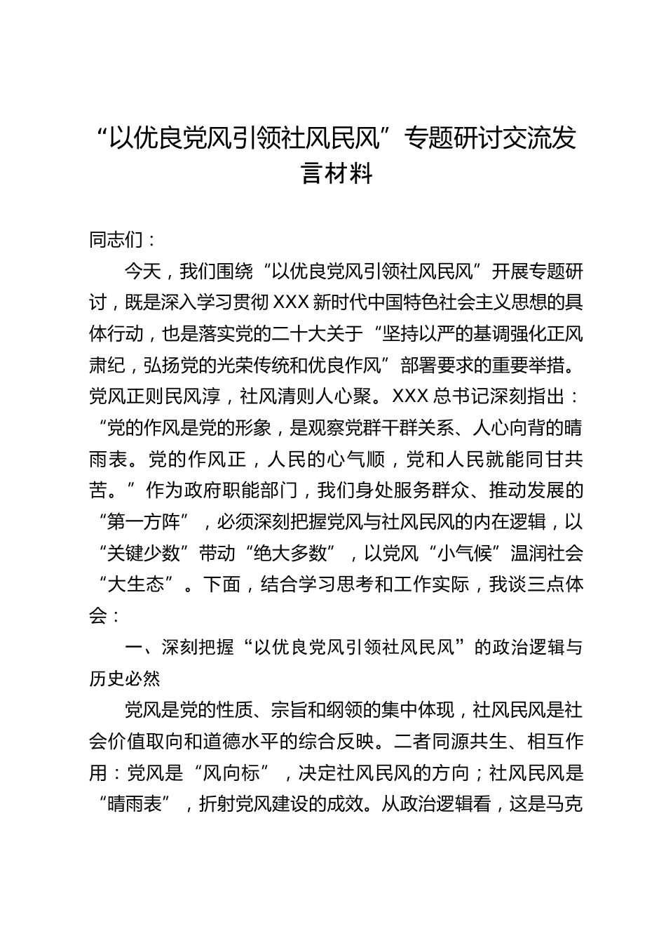 “以優(yōu)良黨風引領社風民風”專題研討交流發(fā)言材料同志們:今天,我們圍繞“以優(yōu)良黨風引領社風民風”開展專題研討,既是深入學習貫徹XXX新時代中國特色社會主義思想的具體行動,也是落實黨的二十大關于“堅持以嚴的基調(diào)強化正風肅紀,弘揚黨的光榮傳統(tǒng)和優(yōu)良作風”部署要求的重要舉措。黨風正則民風淳,社風清則人心聚。XXX總書記深刻指出:“黨的作風是黨的形象,是觀察黨群干群關系、人心向背的晴雨表。黨的作風正,人民的心氣順,黨和人民就能同甘共苦。”作為政府職能部門,我們身處服務群眾、推動發(fā)展的“第一方陣”,必須深刻把握黨風與社風民風的內(nèi)在邏輯,以“關...