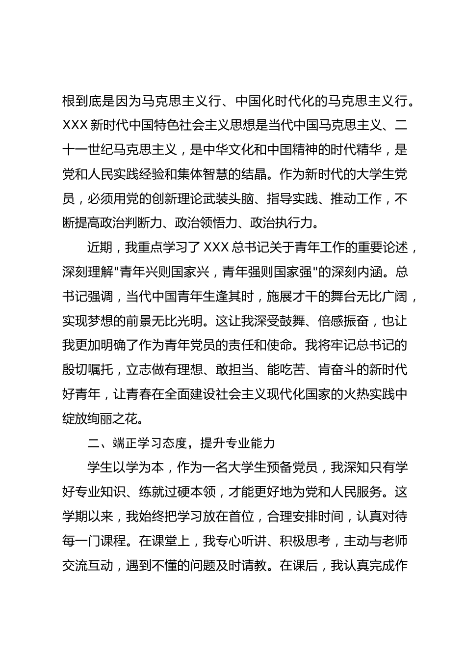 2025年大學(xué)生入黨積極分子(預(yù)備黨員)入黨思想?yún)R報敬愛的黨組織:自從被黨組織批準(zhǔn)為中共預(yù)備黨員以來,在黨組織的關(guān)懷培養(yǎng)下,在支部黨員同志的悉心幫助下,我認(rèn)真學(xué)習(xí)黨的理論知識,不斷提高思想政治覺悟,努力以一名正式黨員的標(biāo)準(zhǔn)嚴(yán)格要求自己,在思想上、學(xué)習(xí)上、工作上和生活中都取得了新的進(jìn)步?,F(xiàn)將近期思想、學(xué)習(xí)、工作和生活情況向黨組織匯報如下。一、堅持理論學(xué)習(xí),筑牢思想根基作為一名預(yù)備黨員,我深知加強(qiáng)理論學(xué)習(xí)是提高政治素養(yǎng)堅定理想信念的根本途徑。這段時間以來,我堅持把學(xué)習(xí)XXX新時代中國特色社會主義思想作為首要政治任務(wù),通過參加黨支部組織...