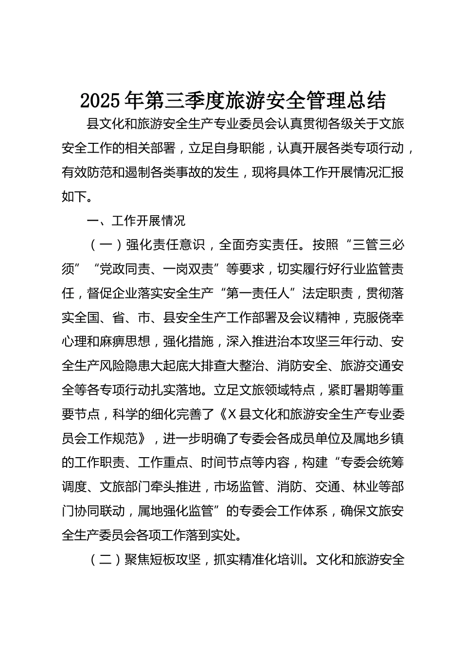 2025年第三季度旅游安全管理總結(jié)縣文化和旅游安全生產(chǎn)專(zhuān)業(yè)委員會(huì)認(rèn)真貫徹各級(jí)關(guān)于文旅安全工作的相關(guān)部署,立足自身職能,認(rèn)真開(kāi)展各類(lèi)專(zhuān)項(xiàng)行動(dòng),有效防范和遏制各類(lèi)事故的發(fā)生,現(xiàn)將具體工作開(kāi)展情況匯報(bào)如下。一、工作開(kāi)展情況(一)強(qiáng)化責(zé)任意識(shí),全面夯實(shí)責(zé)任。按照“三管三必須”“黨政同責(zé)、一崗雙責(zé)”等要求,切實(shí)履行好行業(yè)監(jiān)管責(zé)任,督促企業(yè)落實(shí)安全生產(chǎn)“第一責(zé)任人”法定職責(zé),貫徹落實(shí)全國(guó)、省、市、縣安全生產(chǎn)工作部署及會(huì)議精神,克服僥幸心理和麻痹思想,強(qiáng)化措施,深入推進(jìn)治本攻堅(jiān)三年行動(dòng)、安全生產(chǎn)風(fēng)險(xiǎn)隱患大起底大排查大整治、消防安全、旅游交通安...
