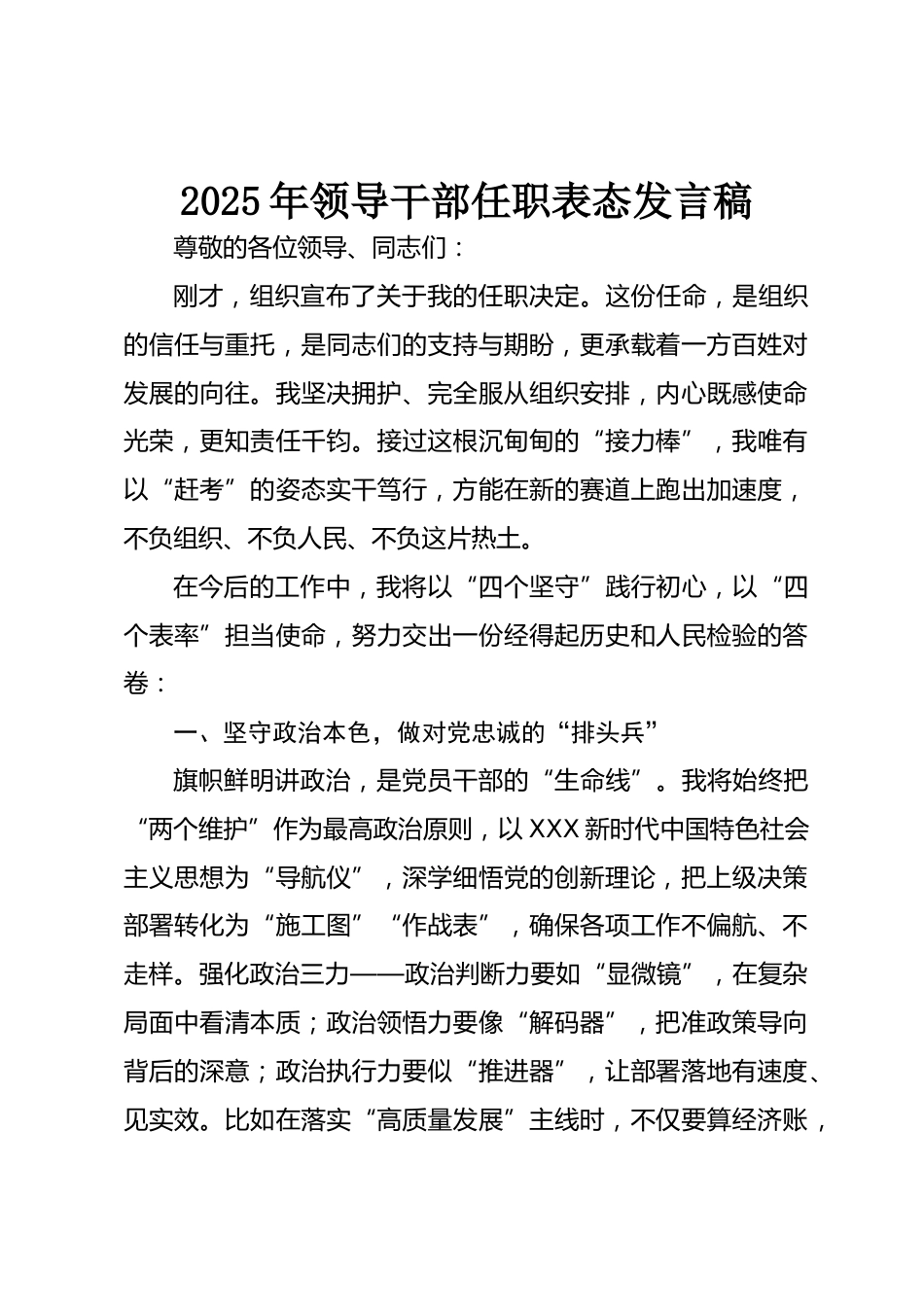 2025年領導干部任職表態(tài)發(fā)言稿尊敬的各位領導、同志們:剛才,組織宣布了關于我的任職決定。這份任命,是組織的信任與重托,是同志們的支持與期盼,更承載著一方百姓對發(fā)展的向往。我堅決擁護、完全服從組織安排,內心既感使命光榮,更知責任千鈞。接過這根沉甸甸的“接力棒”,我唯有以“趕考”的姿態(tài)實干篤行,方能在新的賽道上跑出加速度,不負組織、不負人民、不負這片熱土。在今后的工作中,我將以“四個堅守”踐行初心,以“四個表率”擔當使命,努力交出一份經得起歷史和人民檢驗的答卷:一、堅守政治本色,做對黨忠誠的“排頭兵”旗幟鮮明講政治,是黨員干部的“...