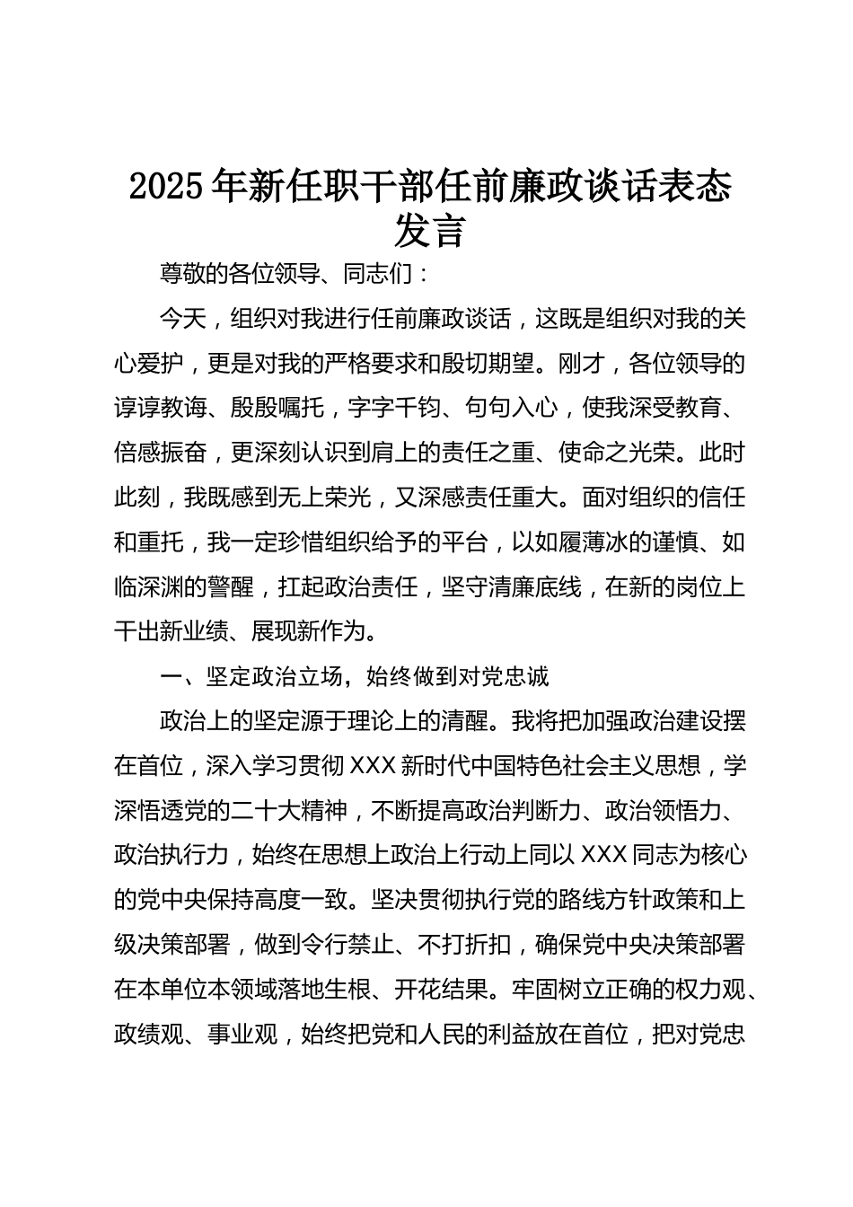2025年新任職干部任前廉政談話表態(tài)發(fā)言尊敬的各位領(lǐng)導(dǎo)、同志們:今天,組織對(duì)我進(jìn)行任前廉政談話,這既是組織對(duì)我的關(guān)心愛護(hù),更是對(duì)我的嚴(yán)格要求和殷切期望。剛才,各位領(lǐng)導(dǎo)的諄諄教誨、殷殷囑托,字字千鈞、句句入心,使我深受教育、倍感振奮,更深刻認(rèn)識(shí)到肩上的責(zé)任之重、使命之光榮。此時(shí)此刻,我既感到無上榮光,又深感責(zé)任重大。面對(duì)組織的信任和重托,我一定珍惜組織給予的平臺(tái),以如履薄冰的謹(jǐn)慎、如臨深淵的警醒,扛起政治責(zé)任,堅(jiān)守清廉底線,在新的崗位上干出新業(yè)績、展現(xiàn)新作為。一、堅(jiān)定政治立場,始終做到對(duì)黨忠誠政治上的堅(jiān)定源于理論上的清醒。我將把加...