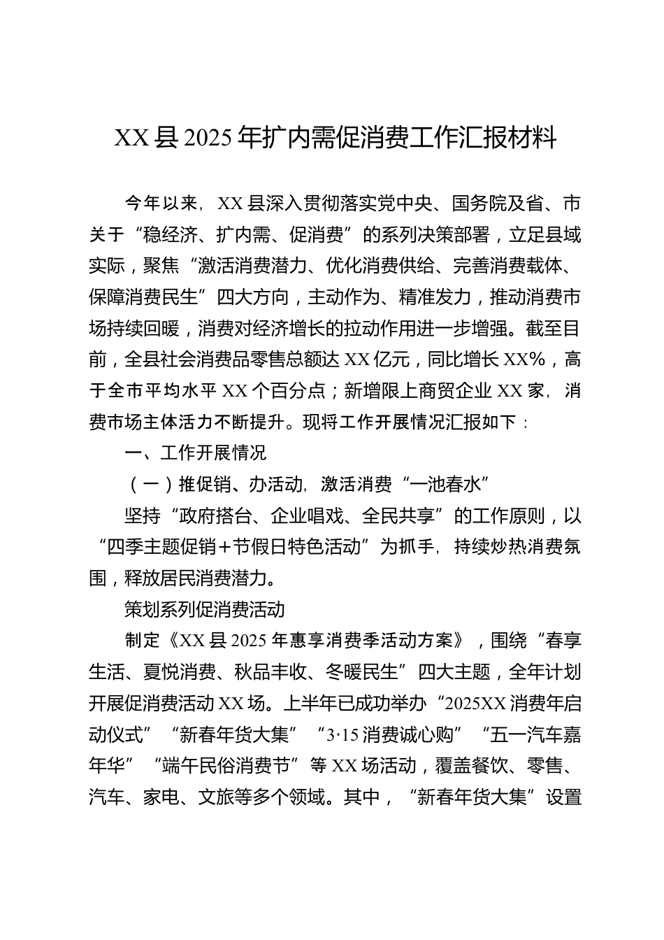 XX縣2025年擴內(nèi)需促消費工作匯報材料今年以來,XX縣深入貫徹落實黨中央、國務(wù)院及省、市關(guān)于“穩(wěn)經(jīng)濟、擴內(nèi)需、促消費”的系列決策部署,立足縣域?qū)嶋H,聚焦“激活消費潛力、優(yōu)化消費供給、完善消費載體、保障消費民生”四大方向,主動作為、精準發(fā)力,推動消費市場持續(xù)回暖,消費對經(jīng)濟增長的拉動作用進一步增強。截至目前,全縣社會消費品零售總額達XX億元,同比增長XX%,高于全市平均水平XX個百分點;新增限上商貿(mào)企業(yè)XX家,消市主體活力不斷提升。將工作開展情況如下:費場現(xiàn)匯報一、工作開展情況(一)推促、活,激活消銷辦動費“一池春水”堅持“政府搭臺、企業(yè)唱...