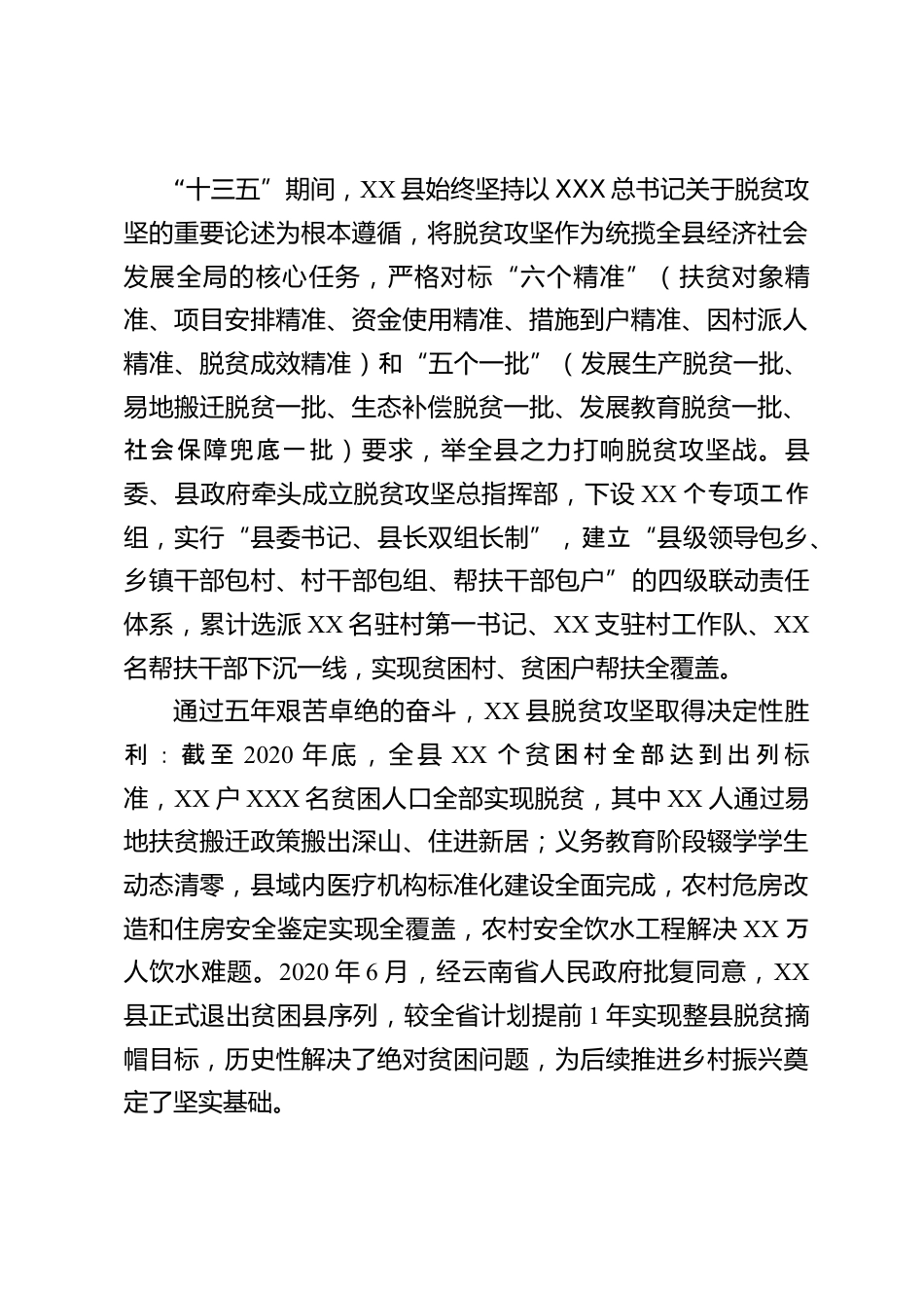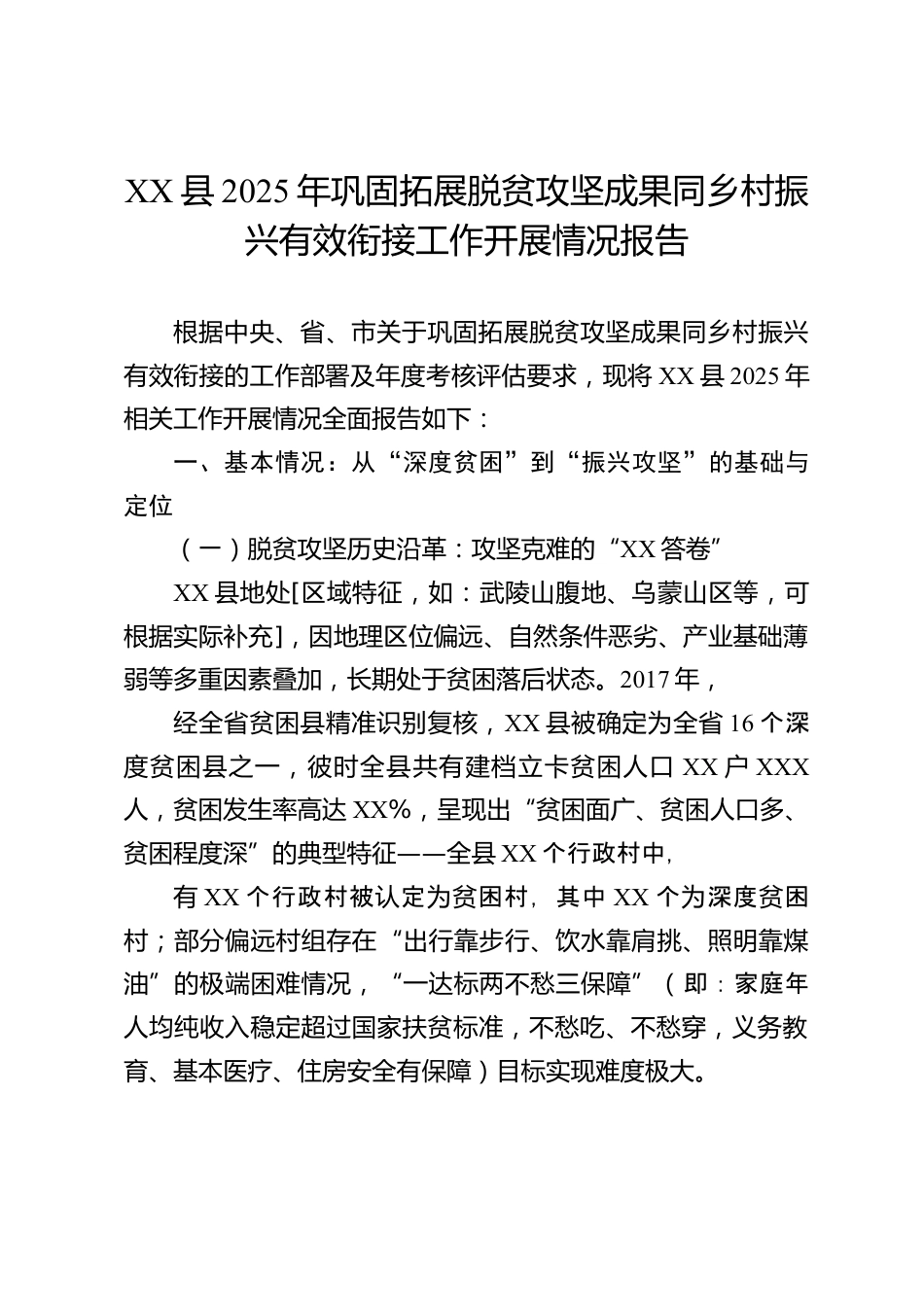 XX縣2025年鞏固拓展脫貧攻堅成果同鄉(xiāng)村振興有效銜接工作開展情況報告根據(jù)中央、省、市關(guān)于鞏固拓展脫貧攻堅成果同鄉(xiāng)村振興有效銜接的工作部署及年度考核評估要求,現(xiàn)將XX縣2025年相關(guān)工作開展情況全面報告如下:一、基本情況:從“深度貧困”到“振興攻堅”的基礎(chǔ)與定位(一)脫貧攻堅歷史沿革:攻堅克難的“XX答卷”XX縣地處[區(qū)域特征,如:武陵山腹地、烏蒙山區(qū)等,可根據(jù)實際補充],因地理區(qū)位偏遠、自然條件惡劣、產(chǎn)業(yè)基礎(chǔ)薄弱等多重因素疊加,長期處于貧困落后狀態(tài)。2017年,經(jīng)全省貧困縣精準(zhǔn)識別復(fù)核,XX縣被確定為全省16個深度貧困縣之一,彼時全縣共有建檔立卡貧...