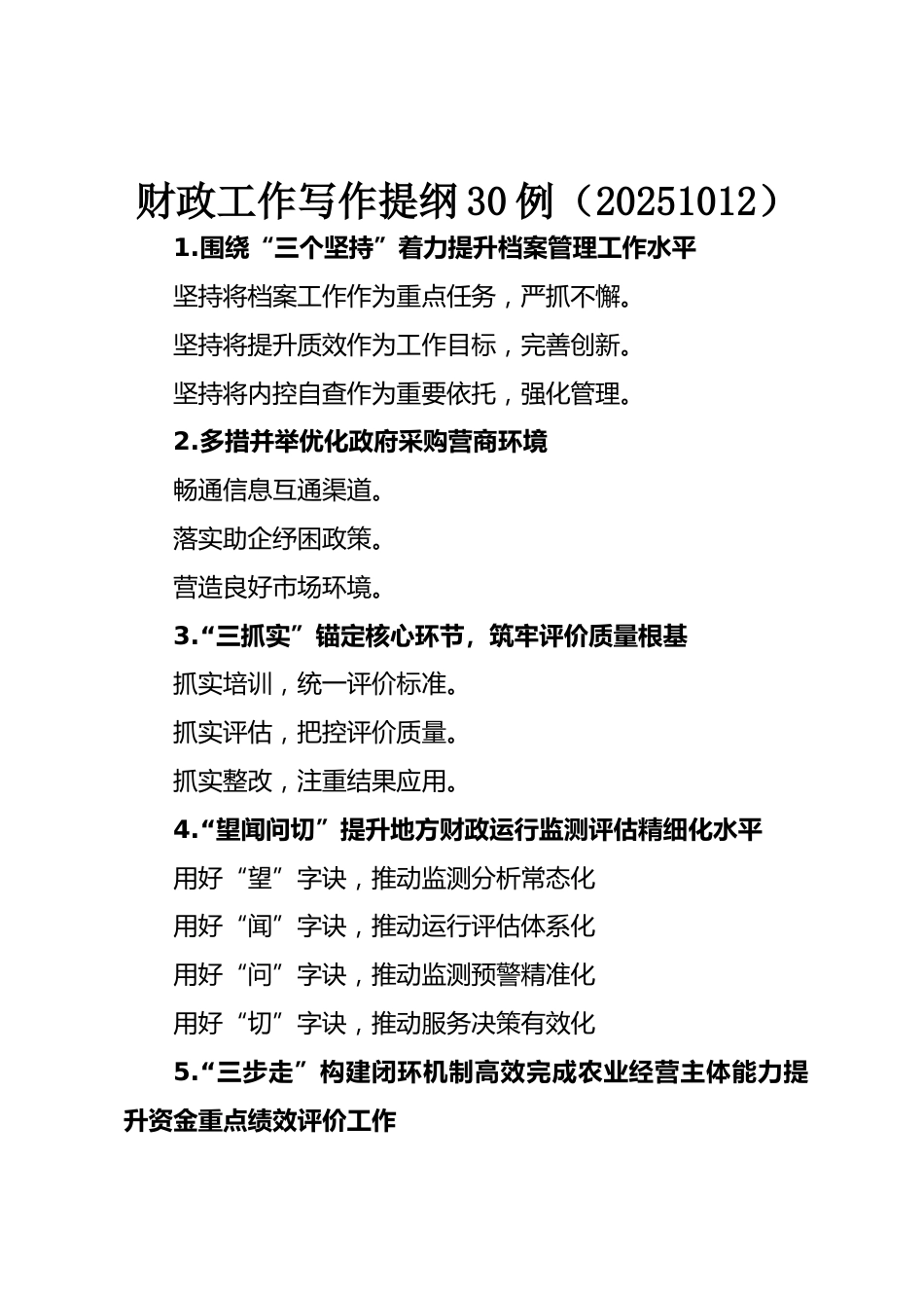 財(cái)政工作寫作提綱30例(20251012)1.圍繞“三個(gè)堅(jiān)持”著力提升檔案管理工作水平堅(jiān)持將檔案工作作為重點(diǎn)任務(wù),嚴(yán)抓不懈。堅(jiān)持將提升質(zhì)效作為工作目標(biāo),完善創(chuàng)新。堅(jiān)持將內(nèi)控自查作為重要依托,強(qiáng)化管理。2.多措并舉優(yōu)化政府采購(gòu)營(yíng)商環(huán)境暢通信息互通渠道。落實(shí)助企紓困政策。營(yíng)造良好市場(chǎng)環(huán)境。3.“三抓實(shí)”錨定核心環(huán)節(jié),筑牢評(píng)價(jià)質(zhì)量根基抓實(shí)培訓(xùn),統(tǒng)一評(píng)價(jià)標(biāo)準(zhǔn)。抓實(shí)評(píng)估,把控評(píng)價(jià)質(zhì)量。抓實(shí)整改,注重結(jié)果應(yīng)用。4.“望聞問(wèn)切”提升地方財(cái)政運(yùn)行監(jiān)測(cè)評(píng)估精細(xì)化水平用好“望”字訣,推動(dòng)監(jiān)測(cè)分析常態(tài)化用好“聞”字訣,推動(dòng)運(yùn)行評(píng)估體系化用好“問(wèn)”字訣,推動(dòng)監(jiān)測(cè)預(yù)警...