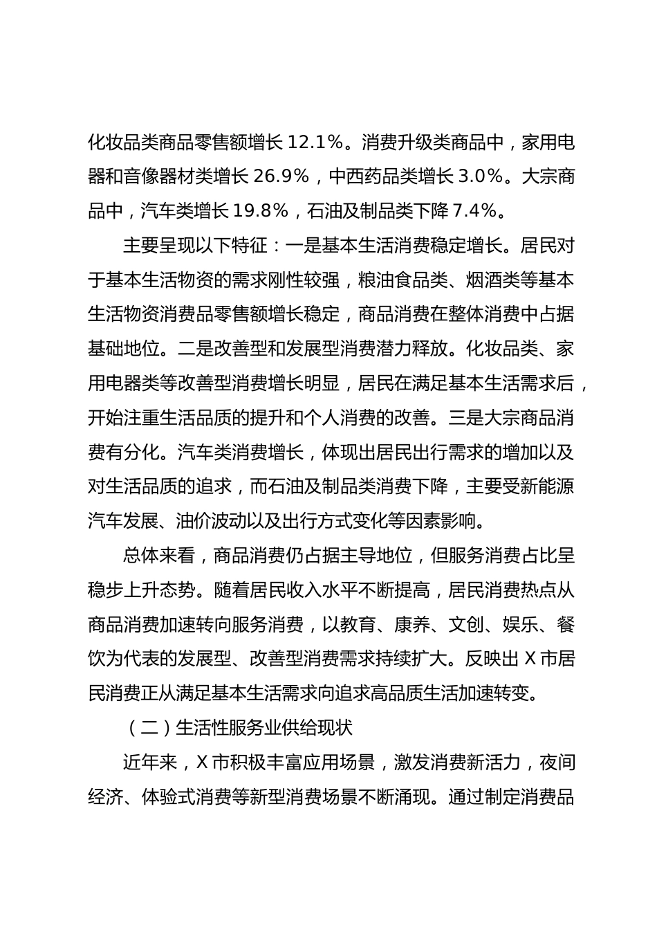 關(guān)于推動(dòng)生活性服務(wù)業(yè)提質(zhì)升級促進(jìn)全市消費(fèi)的調(diào)研報(bào)告XXX總書記指出,要建立起擴(kuò)大內(nèi)需的有效制度,釋放內(nèi)需潛力,加快培育完整內(nèi)需體系,加強(qiáng)需求側(cè)管理,擴(kuò)大居民消費(fèi),提升消費(fèi)層次,使建設(shè)超大規(guī)模的國內(nèi)市場成為一個(gè)可持續(xù)的歷史過程。擴(kuò)大內(nèi)需,必然離不開生活性服務(wù)業(yè)的提質(zhì)升級。生活性服務(wù)業(yè)是直接向居民個(gè)人或家庭提供物質(zhì)與精神生活消費(fèi)產(chǎn)品及服務(wù)的產(chǎn)業(yè),其核心功能在于滿足居民最終消費(fèi)需求。本次調(diào)研第二組利用一天時(shí)間,通過實(shí)地走訪、查閱資料、觀看展片等方式,調(diào)研了X市文創(chuàng)產(chǎn)業(yè)園、X廣場、X市康復(fù)中心醫(yī)院康養(yǎng)公寓,并隨機(jī)走訪了部分熱門消費(fèi)場景地,...