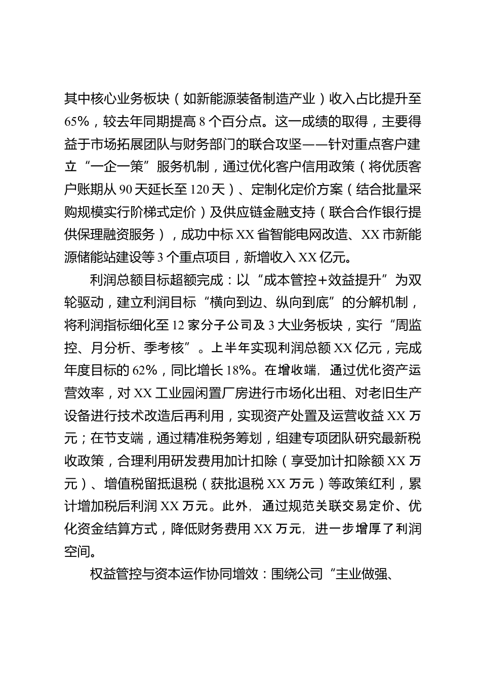 某國企財(cái)務(wù)資產(chǎn)部2025年上半年工作總結(jié)2025年上半年,面對復(fù)雜多變的市場環(huán)境與國企改革深化要求,財(cái)務(wù)資產(chǎn)部在公司黨委的堅(jiān)強(qiáng)領(lǐng)導(dǎo)下,深入貫徹落實(shí)“穩(wěn)增長、防風(fēng)險(xiǎn)、強(qiáng)管理、促轉(zhuǎn)型”工作主線,以“服務(wù)戰(zhàn)略、支撐經(jīng)營、創(chuàng)造價(jià)值”為核心目標(biāo),緊扣“增收節(jié)支、提質(zhì)增效”關(guān)鍵任務(wù),統(tǒng)籌推進(jìn)財(cái)務(wù)基礎(chǔ)管理、資金統(tǒng)籌運(yùn)作、風(fēng)險(xiǎn)防控體系構(gòu)建及數(shù)字化轉(zhuǎn)型等重點(diǎn)工作,為公司上半年實(shí)現(xiàn)“時(shí)間過半、任務(wù)超半”的經(jīng)營目標(biāo)提供了堅(jiān)實(shí)財(cái)務(wù)保障。現(xiàn)將本部門上半年工作情況總結(jié)如下:一、聚焦主責(zé)主業(yè),以“進(jìn)”字突破推動經(jīng)營質(zhì)效雙提升本年度,財(cái)務(wù)資產(chǎn)部堅(jiān)持“開源與節(jié)流并重...