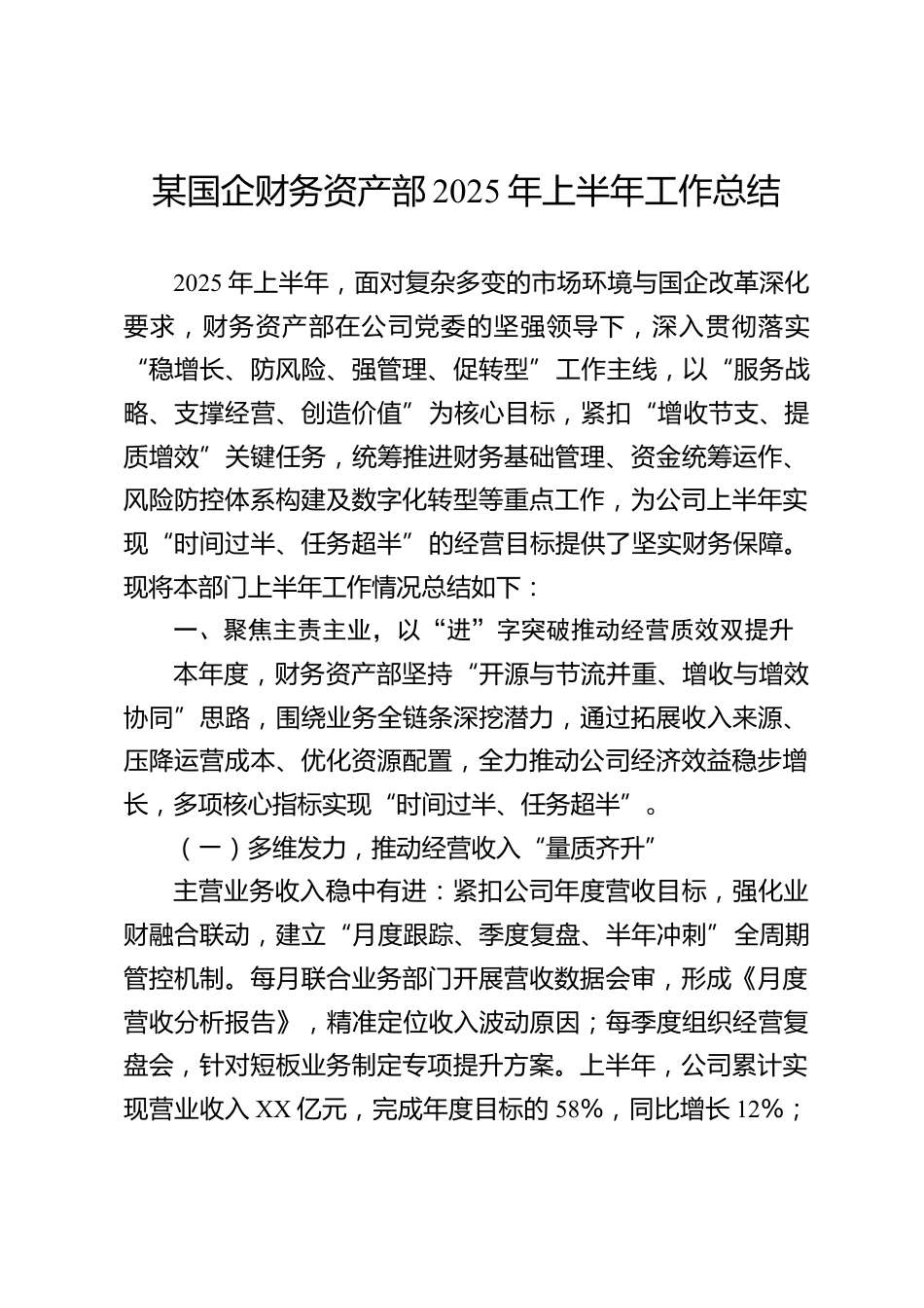 某國企財(cái)務(wù)資產(chǎn)部2025年上半年工作總結(jié)2025年上半年,面對(duì)復(fù)雜多變的市場環(huán)境與國企改革深化要求,財(cái)務(wù)資產(chǎn)部在公司黨委的堅(jiān)強(qiáng)領(lǐng)導(dǎo)下,深入貫徹落實(shí)“穩(wěn)增長、防風(fēng)險(xiǎn)、強(qiáng)管理、促轉(zhuǎn)型”工作主線,以“服務(wù)戰(zhàn)略、支撐經(jīng)營、創(chuàng)造價(jià)值”為核心目標(biāo),緊扣“增收節(jié)支、提質(zhì)增效”關(guān)鍵任務(wù),統(tǒng)籌推進(jìn)財(cái)務(wù)基礎(chǔ)管理、資金統(tǒng)籌運(yùn)作、風(fēng)險(xiǎn)防控體系構(gòu)建及數(shù)字化轉(zhuǎn)型等重點(diǎn)工作,為公司上半年實(shí)現(xiàn)“時(shí)間過半、任務(wù)超半”的經(jīng)營目標(biāo)提供了堅(jiān)實(shí)財(cái)務(wù)保障。現(xiàn)將本部門上半年工作情況總結(jié)如下:一、聚焦主責(zé)主業(yè),以“進(jìn)”字突破推動(dòng)經(jīng)營質(zhì)效雙提升本年度,財(cái)務(wù)資產(chǎn)部堅(jiān)持“開源與節(jié)流并重...