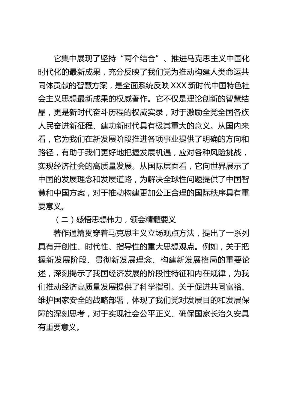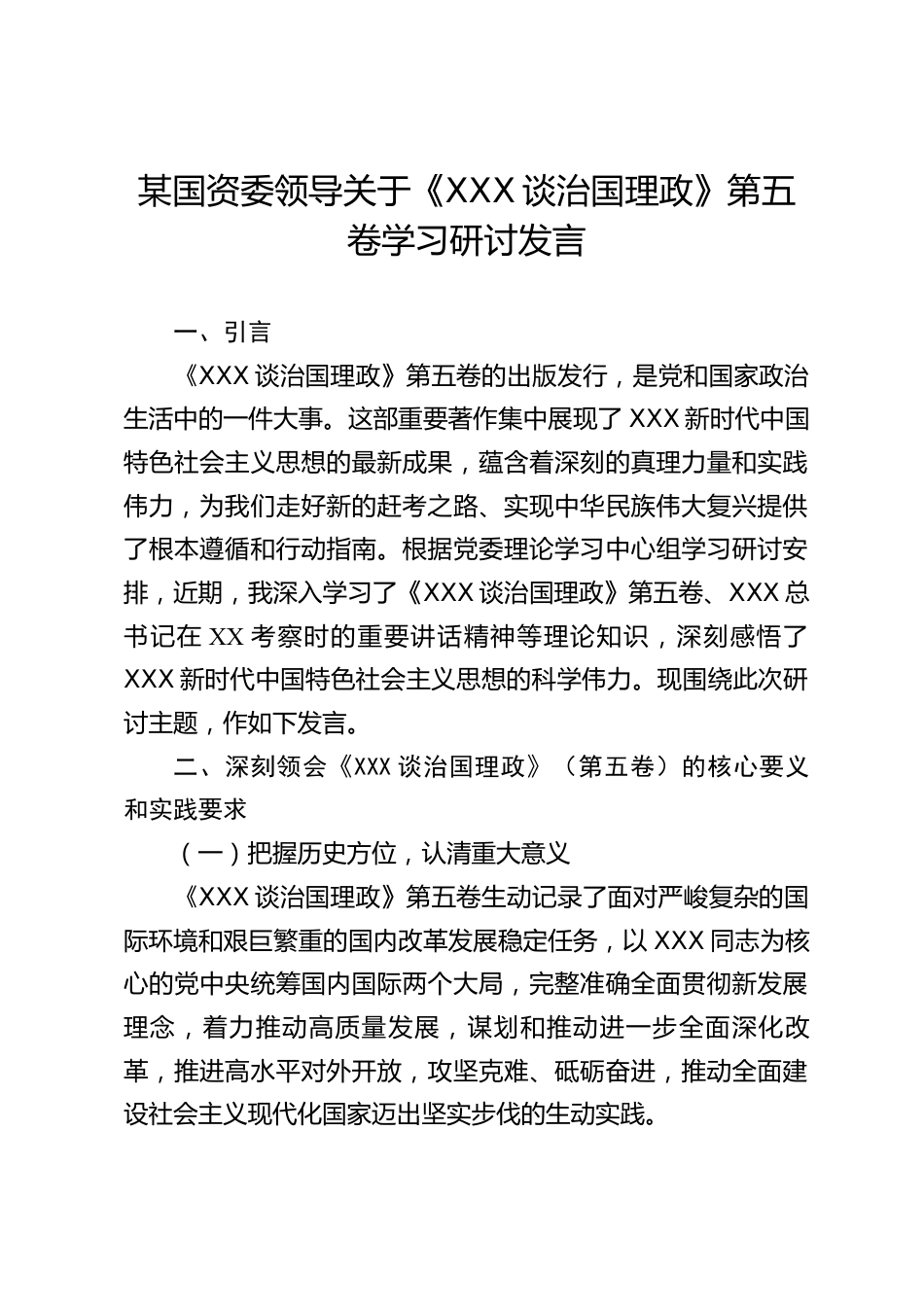某國資委領導關于《XXX談治國理政》第五卷學習研討發(fā)言一、引言《XXX談治國理政》第五卷的出版發(fā)行,是黨和國家政治生活中的一件大事。這部重要著作集中展現了XXX新時代中國特色社會主義思想的最新成果,蘊含著深刻的真理力量和實踐偉力,為我們走好新的趕考之路、實現中華民族偉大復興提供了根本遵循和行動指南。根據黨委理論學習中心組學習研討安排,近期,我深入學習了《XXX談治國理政》第五卷、XXX總書記在XX考察時的重要講話精神等理論知識,深刻感悟了XXX新時代中國特色社會主義思想的科學偉力。現圍繞此次研討主題,作如下發(fā)言。二、深刻領會《XXX談治國理政》(...