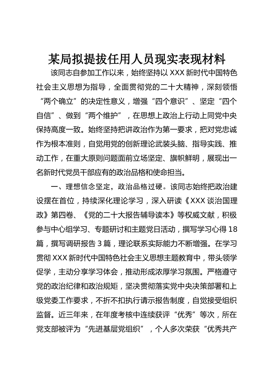 某局?jǐn)M提拔任用人員現(xiàn)實(shí)表現(xiàn)材料