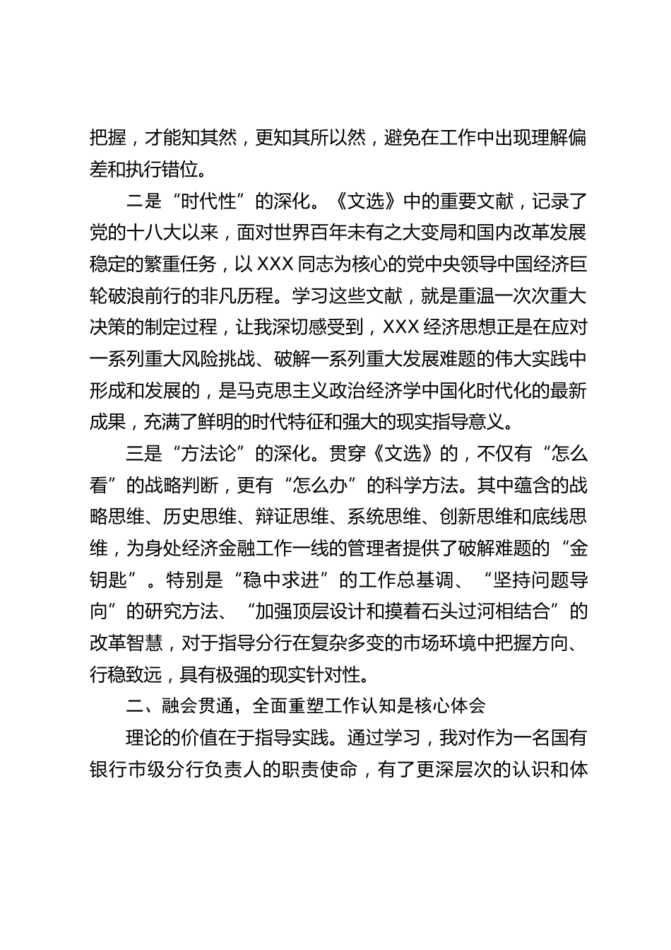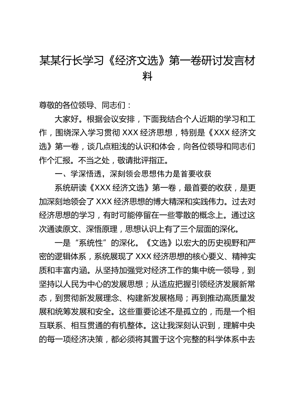 某某行長學習《經濟文選》第一卷研討發(fā)言材料
