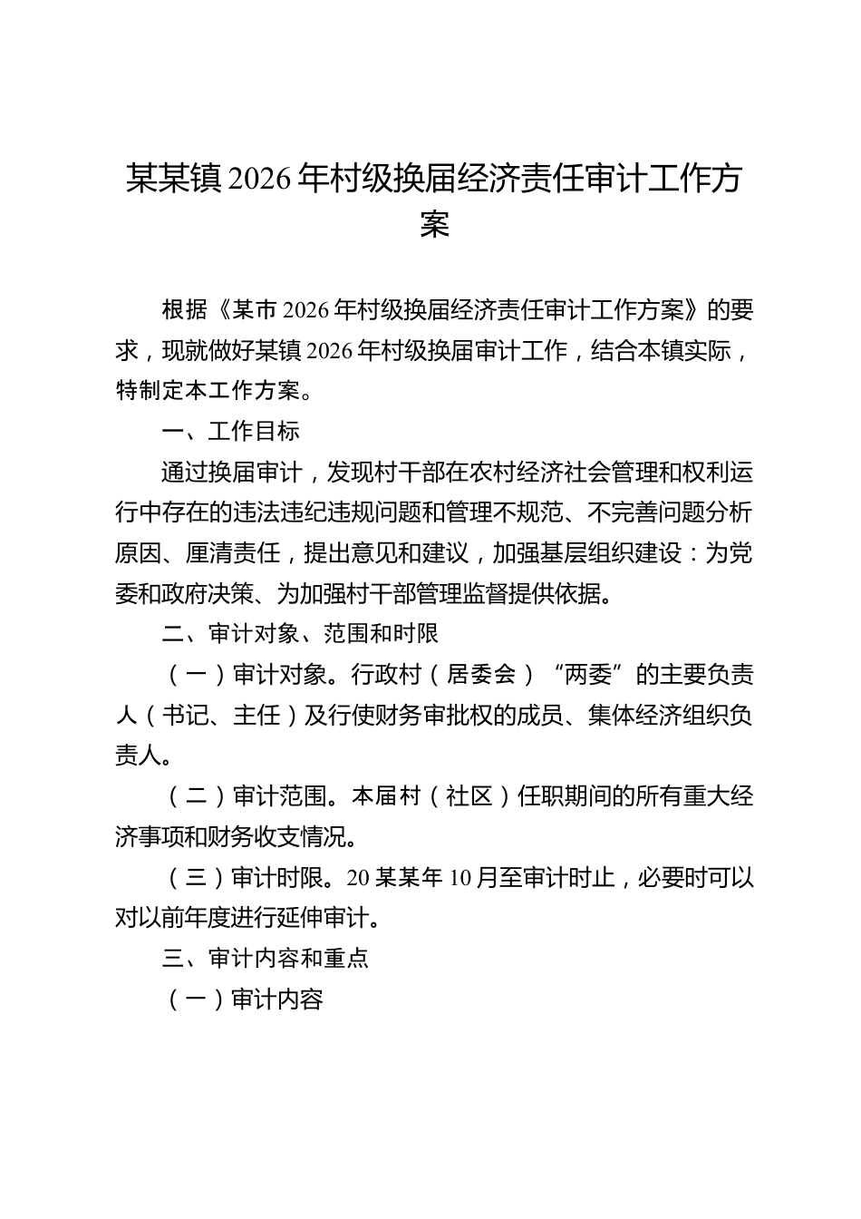 某某鎮(zhèn)2026年村級(jí)換屆經(jīng)濟(jì)責(zé)任審計(jì)工作方案根據(jù)《某市2026年村級(jí)換屆經(jīng)濟(jì)責(zé)任審計(jì)工作方案》的要求,現(xiàn)就做好某鎮(zhèn)2026年村級(jí)換屆審計(jì)工作,結(jié)合本鎮(zhèn)實(shí)際,特制定本工作方案。一、工作目標(biāo)通過換屆審計(jì),發(fā)現(xiàn)村干部在農(nóng)村經(jīng)濟(jì)社會(huì)管理和權(quán)利運(yùn)行中存在的違法違紀(jì)違規(guī)問題和管理不規(guī)范、不完善問題分析原因、厘清責(zé)任,提出意見和建議,加強(qiáng)基層組織建設(shè):為黨委和政府決策、為加強(qiáng)村干部管理監(jiān)督提供依據(jù)。二、審計(jì)對(duì)象、范圍和時(shí)限(一)審計(jì)對(duì)象。行政村(居委會(huì))“兩委”的主要負(fù)責(zé)人(書記、主任)及行使財(cái)務(wù)審批權(quán)的成員、集體經(jīng)濟(jì)組織負(fù)責(zé)人。(二)審計(jì)范圍。本屆...