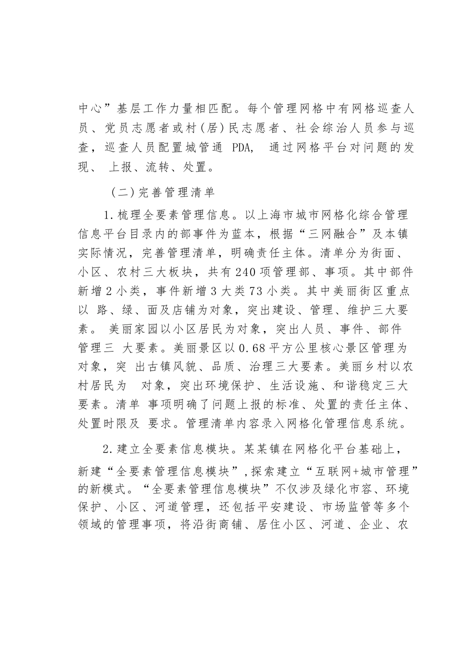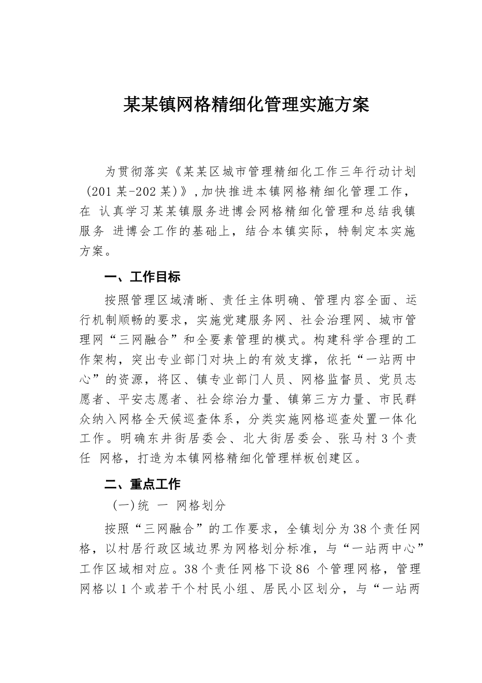 某某鎮(zhèn)網(wǎng)格精細化管理實施方案為貫徹落實《某某區(qū)城市管理精細化工作三年行動計劃(201某-202某)》,加快推進本鎮(zhèn)網(wǎng)格精細化管理工作,在認真學(xué)習(xí)某某鎮(zhèn)服務(wù)進博會網(wǎng)格精細化管理和總結(jié)我鎮(zhèn)服務(wù)進博會工作的基礎(chǔ)上,結(jié)合本鎮(zhèn)實際,特制定本實施方案。一、工作目標(biāo)按照管理區(qū)域清晰、責(zé)任主體明確、管理內(nèi)容全面、運行機制順暢的要求,實施黨建服務(wù)網(wǎng)、社會治理網(wǎng)、城市管理網(wǎng)“三網(wǎng)融合”和全要素管理的模式。構(gòu)建科學(xué)合理的工作架構(gòu),突出專業(yè)部門對塊上的有效支撐,依托“一站兩中心”的資源,將區(qū)、鎮(zhèn)專業(yè)部門人員、網(wǎng)格監(jiān)督員、黨員志愿者、平安志愿者、社會綜治力量、...
