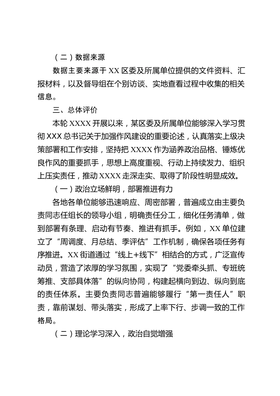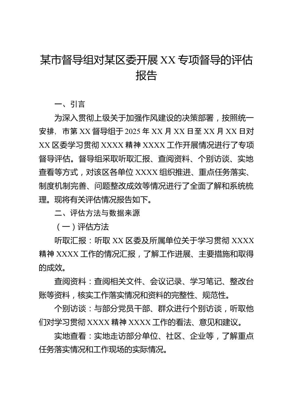 某市督導(dǎo)組對(duì)某區(qū)委開(kāi)展XX專項(xiàng)督導(dǎo)的評(píng)估報(bào)告一、引言為深入貫徹上級(jí)關(guān)于加強(qiáng)作風(fēng)建設(shè)的決策部署,按照統(tǒng)一安排,市第XX督導(dǎo)組于2025年XX月XX日至XX月XX日對(duì)XX區(qū)委學(xué)習(xí)貫徹XXXX精神XXXX工作開(kāi)展情況進(jìn)行了專項(xiàng)督導(dǎo)評(píng)估。督導(dǎo)組采取聽(tīng)取匯報(bào)、查閱資料、個(gè)別訪談、實(shí)地查看等方式,對(duì)該區(qū)各單位XXXX組織推進(jìn)、重點(diǎn)任務(wù)落實(shí)、制度機(jī)制完善、問(wèn)題整改成效等情況進(jìn)行了全面了解和系統(tǒng)梳理。現(xiàn)將有關(guān)評(píng)估情況報(bào)告如下。二、評(píng)估方法與數(shù)據(jù)來(lái)源(一)評(píng)估方法聽(tīng)取匯報(bào):聽(tīng)取XX區(qū)委及所屬單位關(guān)于學(xué)習(xí)貫徹XXXX精神XXXX工作的情況匯報(bào),了解工作進(jìn)展、主要措施和取得的成效。查閱...