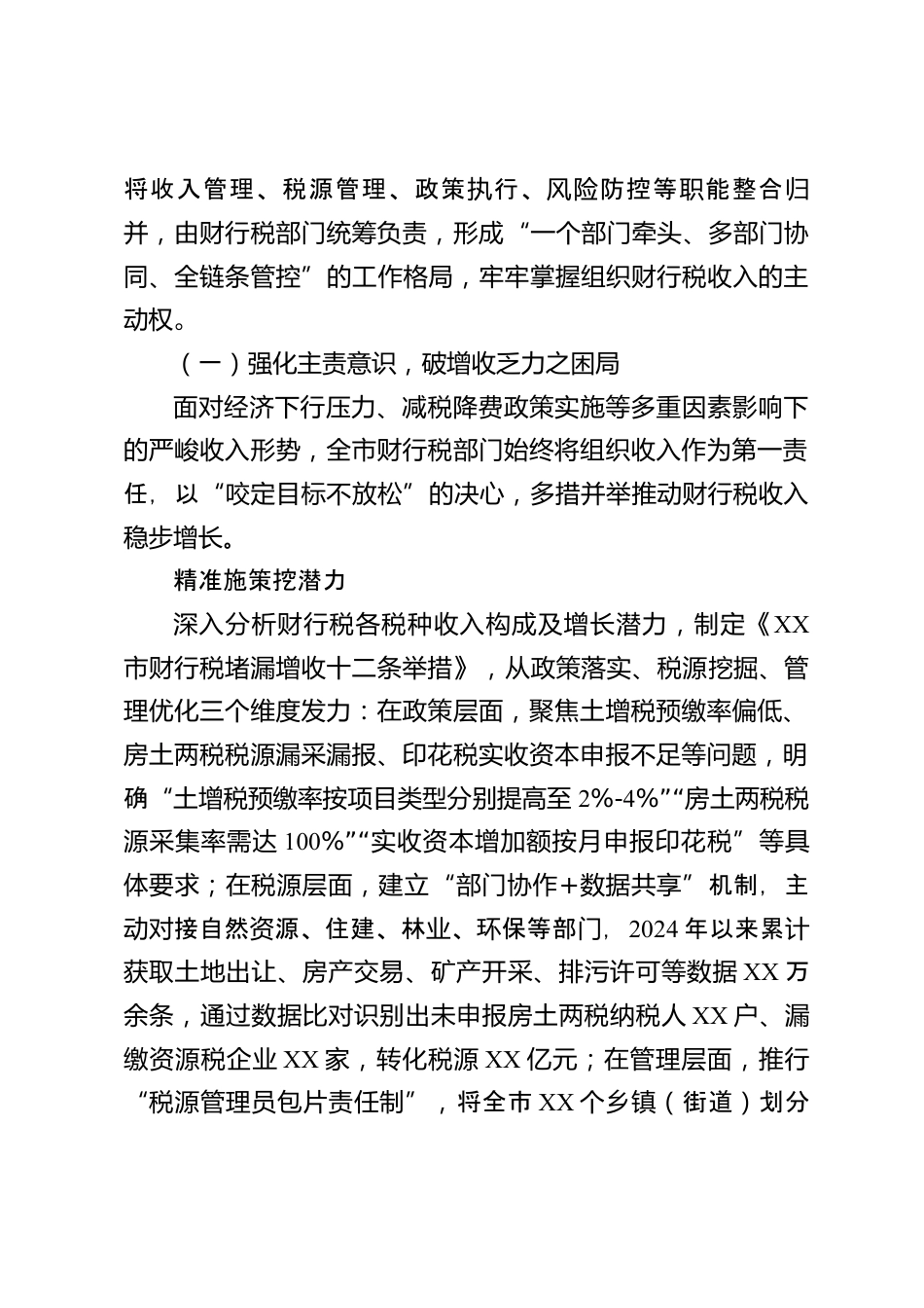 某市稅務(wù)局構(gòu)建財(cái)產(chǎn)和行為稅管理新體系經(jīng)驗(yàn)總結(jié)近年來,XX市稅務(wù)局深入貫徹落實(shí)國家稅務(wù)總局、省稅務(wù)局關(guān)于稅種管理的決策部署,特別是圍繞省局XX局長在全省稅務(wù)工作會(huì)議上提出的“去稅政化、強(qiáng)化稅種管理”要求,秉持“先立后破”工作理念,聚焦財(cái)產(chǎn)和行為稅(以下簡稱“財(cái)行稅”)管理中的痛點(diǎn)、難點(diǎn)問題,著力推動(dòng)“三立三破”(立“一體化”、破“一段式”,立“全周期”、破“碎片化”,立“集成式”、破“分散化”),構(gòu)建起融收入管理、稅源管理、政策管理、風(fēng)險(xiǎn)管理為一體的“全鏈條、全周期、集成式”行稅管理新體系,了行稅管理從財(cái)實(shí)現(xiàn)財(cái)“粗放式”向“精細(xì)化...