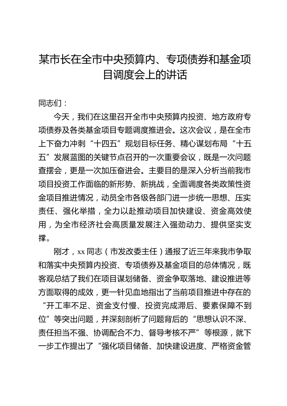 某市長在全市中央預算內(nèi)、專項債券和基金項目調(diào)度會上的講話