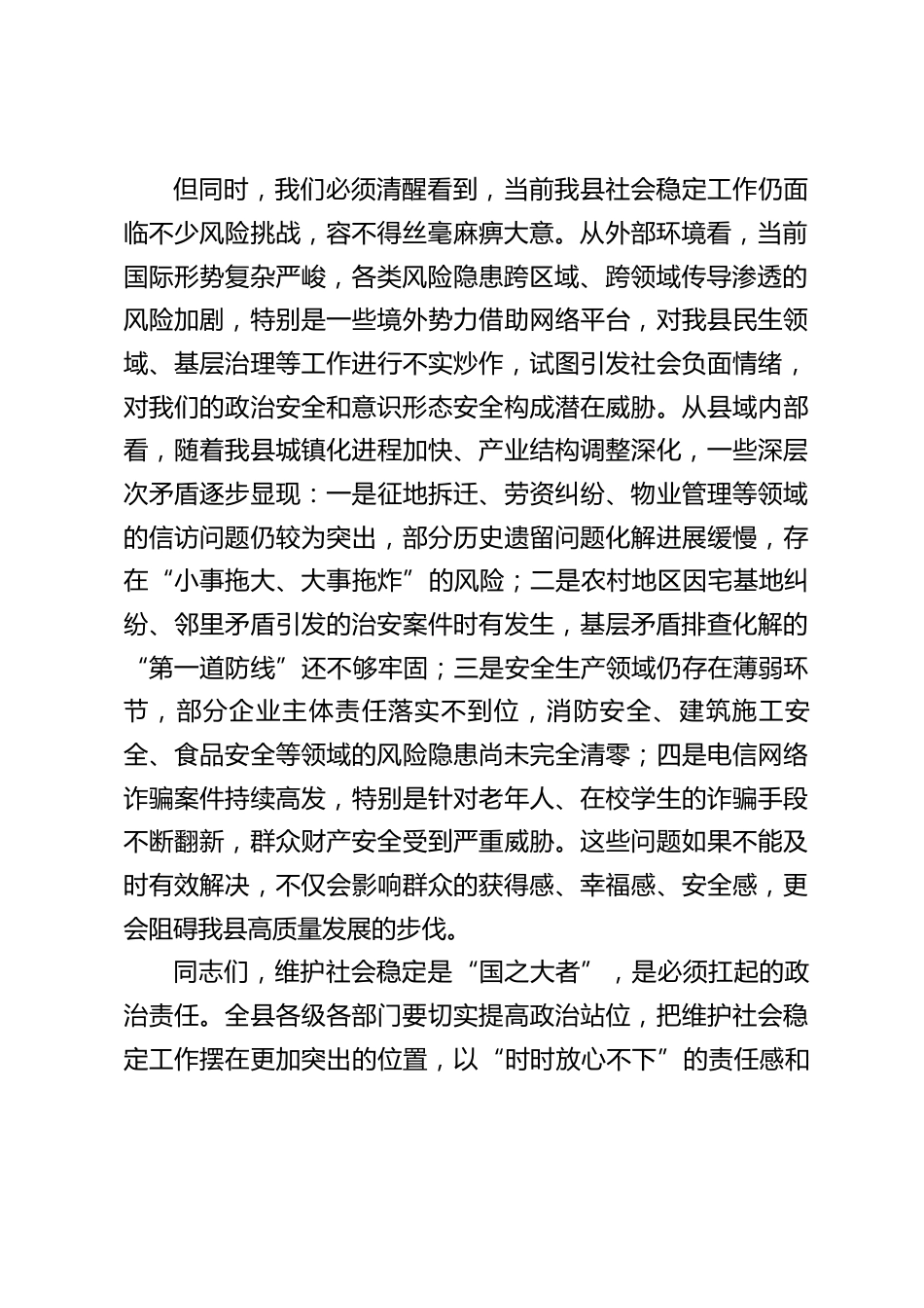 某縣委書(shū)記在全縣維護(hù)社會(huì)穩(wěn)定工作會(huì)議上的講話同志們:今天我們召開(kāi)全縣維護(hù)社會(huì)穩(wěn)定工作會(huì)議,主要任務(wù)是深入學(xué)習(xí)貫徹XXX總書(shū)記關(guān)于維護(hù)國(guó)家安全和社會(huì)穩(wěn)定的重要論述,全面落實(shí)中央、省委、市委關(guān)于平安建設(shè)的決策部署,分析當(dāng)前我縣社會(huì)穩(wěn)定形勢(shì),安排部署下一階段重點(diǎn)工作,動(dòng)員全縣上下進(jìn)一步統(tǒng)一思想、壓實(shí)責(zé)任、真抓實(shí)干,為全縣經(jīng)濟(jì)社會(huì)高質(zhì)量發(fā)展筑牢安全穩(wěn)定屏障。首先,我們要清醒認(rèn)識(shí)當(dāng)前我縣社會(huì)穩(wěn)定工作面臨的形勢(shì)。從總體上看,近年來(lái)全縣上下堅(jiān)決貫徹落實(shí)黨中央和上級(jí)黨委決策部署,以平安XX建設(shè)為總抓手,以防范化解重大風(fēng)險(xiǎn)為關(guān)鍵,在政治安全守護(hù)、...