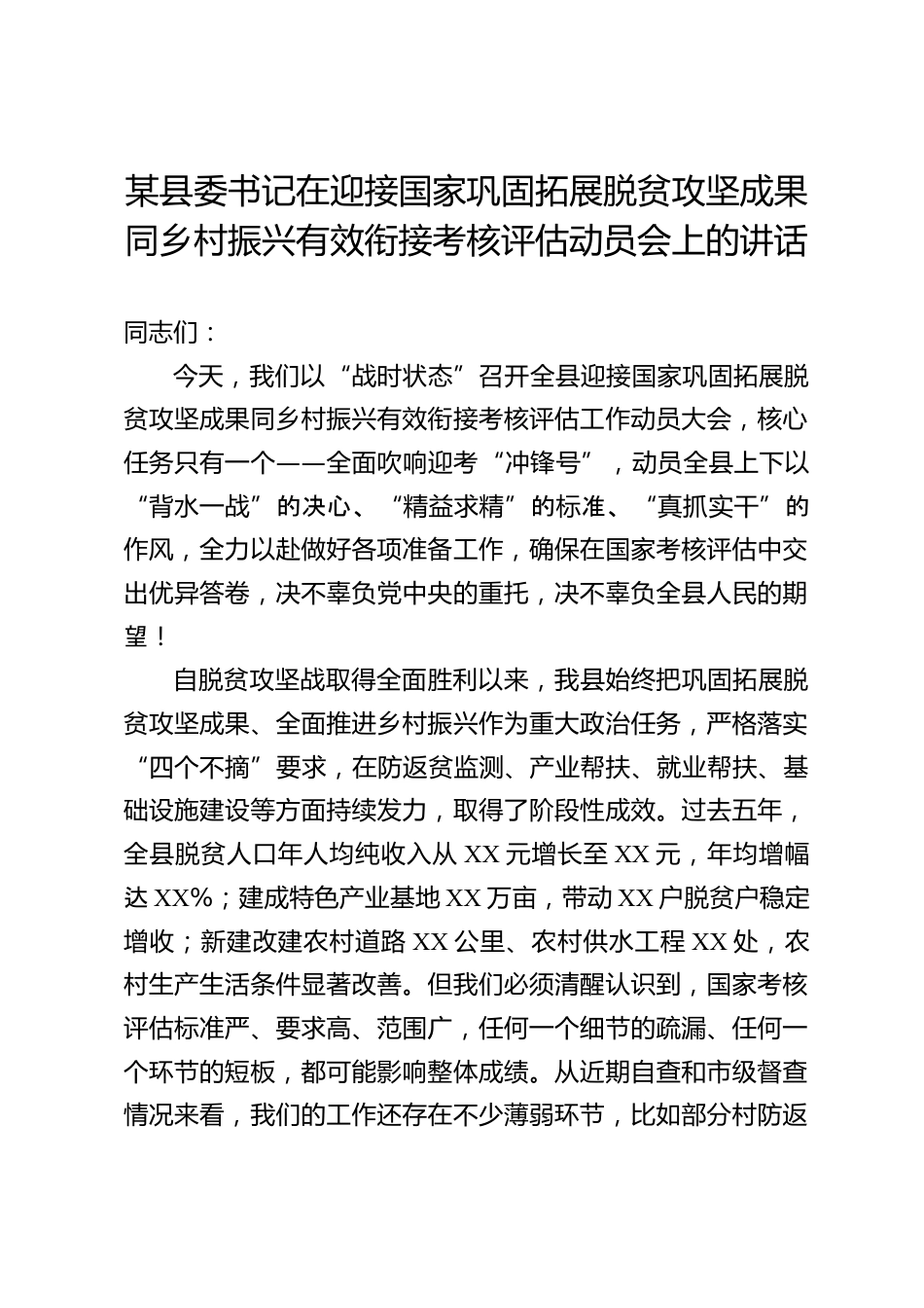 某縣委書記在迎接國家鞏固拓展脫貧攻堅成果同鄉(xiāng)村振興有效銜接考核評估動員會上的講話