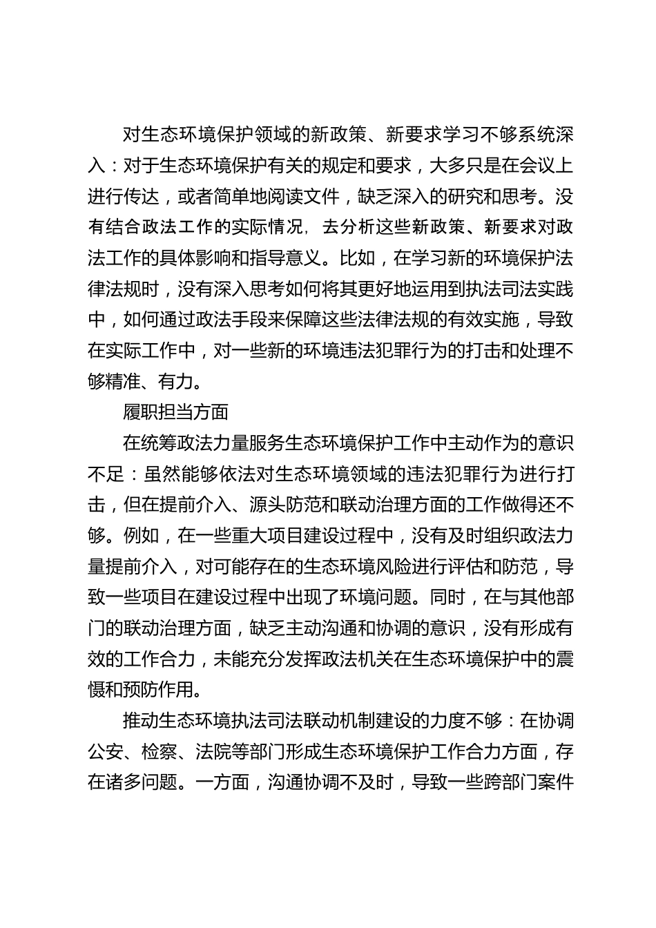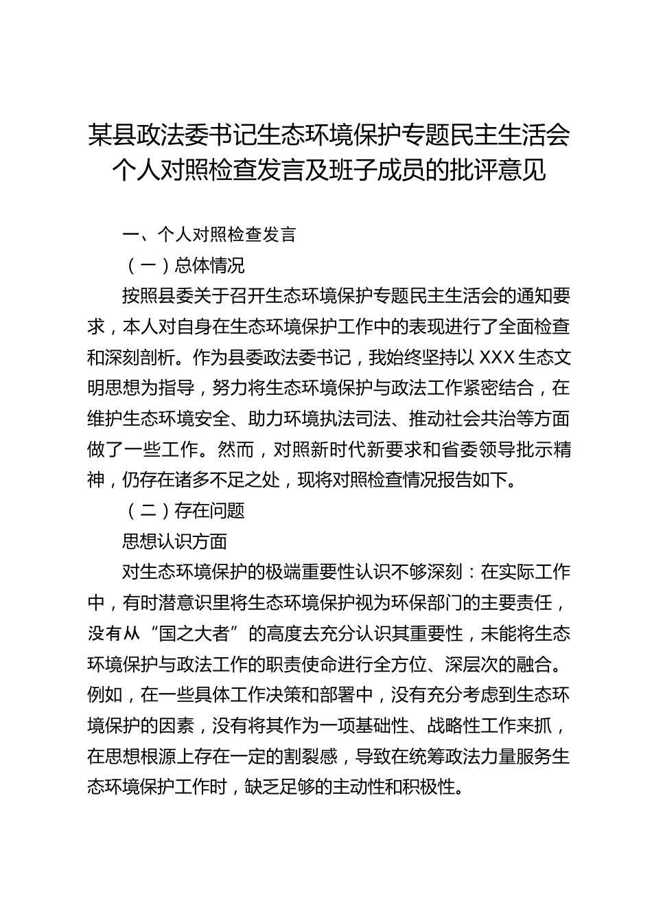 某縣政法委書記生態(tài)環(huán)境保護專題民主生活會個人對照檢查發(fā)言及班子成員的批評意見