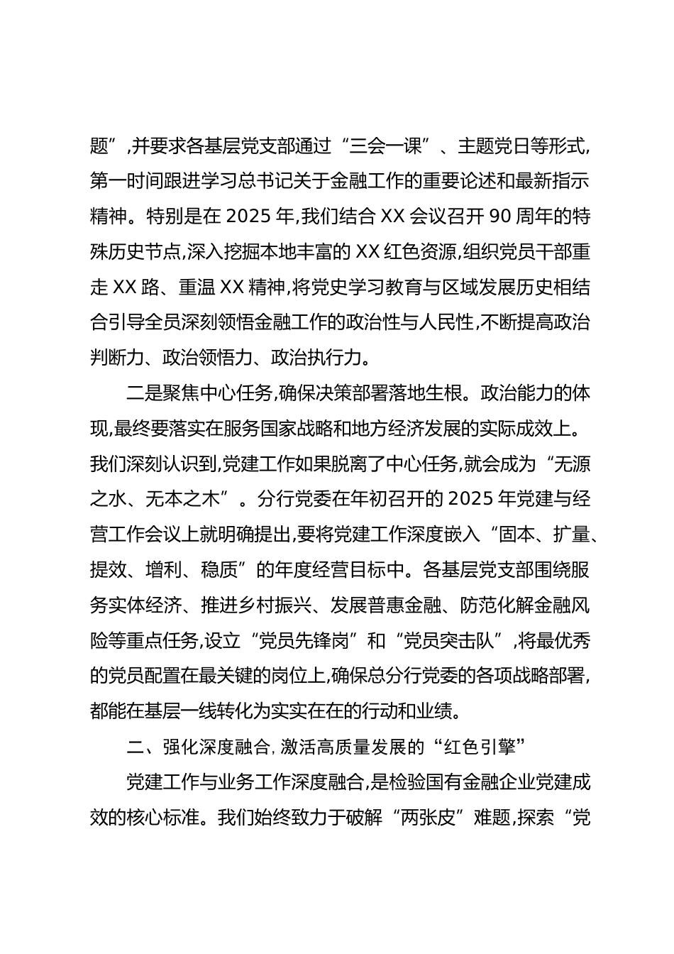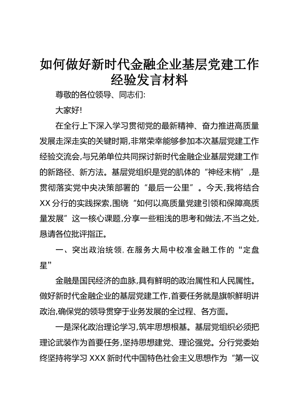 如何做好新時代金融企業(yè)基層黨建工作經(jīng)驗(yàn)發(fā)言材料尊敬的各位領(lǐng)導(dǎo)、同志們:大家好!在全行上下深入學(xué)習(xí)貫徹黨的最新精神、奮力推進(jìn)高質(zhì)量發(fā)展走深走實(shí)的關(guān)鍵時期,非常榮幸能夠參加本次基層黨建工作經(jīng)驗(yàn)交流會,與兄弟單位共同探討新時代金融企業(yè)基層黨建工作的新路徑、新方法?;鶎狱h組織是黨的肌體的“神經(jīng)末梢”,是貫徹落實(shí)黨中央決策部署的“最后一公里”。今天,我將結(jié)合XX分行的實(shí)踐探索,圍繞“如何以高質(zhì)量黨建引領(lǐng)和保障高質(zhì)量發(fā)展”這一核心課題,分享一些粗淺的思考和做法,不當(dāng)之處,懇請各位批評指正。一、突出政治統(tǒng)領(lǐng),在服務(wù)大局中校準(zhǔn)金融工作的“定盤星”金融是...