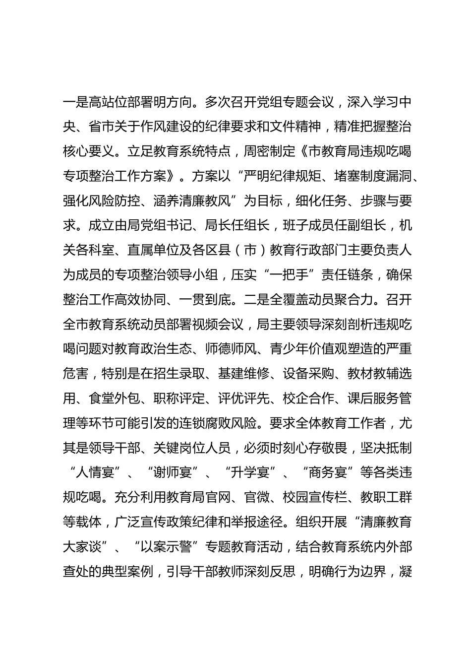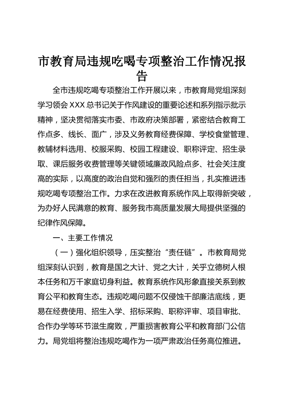 市教育局違規(guī)吃喝專項整治工作情況報告全市違規(guī)吃喝專項整治工作開展以來,市教育局黨組深刻學(xué)習(xí)領(lǐng)會XXX總書記關(guān)于作風(fēng)建設(shè)的重要論述和系列指示批示精神,堅決貫徹落實市委、市政府決策部署,緊密結(jié)合教育工作點多、線長、面廣,涉及義務(wù)教育經(jīng)費保障、學(xué)校食堂管理、教輔材料選用、校服采購、校園工程建設(shè)、職稱評定、招生錄取、課后服務(wù)收費管理等關(guān)鍵領(lǐng)域廉政風(fēng)險點多、社會關(guān)注度高的實際,以高度的政治自覺和強烈的責(zé)任擔(dān)當(dāng),扎實推進違規(guī)吃喝專項整治工作。力求在改進教育系統(tǒng)作風(fēng)上取得新突破,為辦好人民滿意的教育、服務(wù)我市高質(zhì)量發(fā)展大局提供堅強的紀律作風(fēng)...