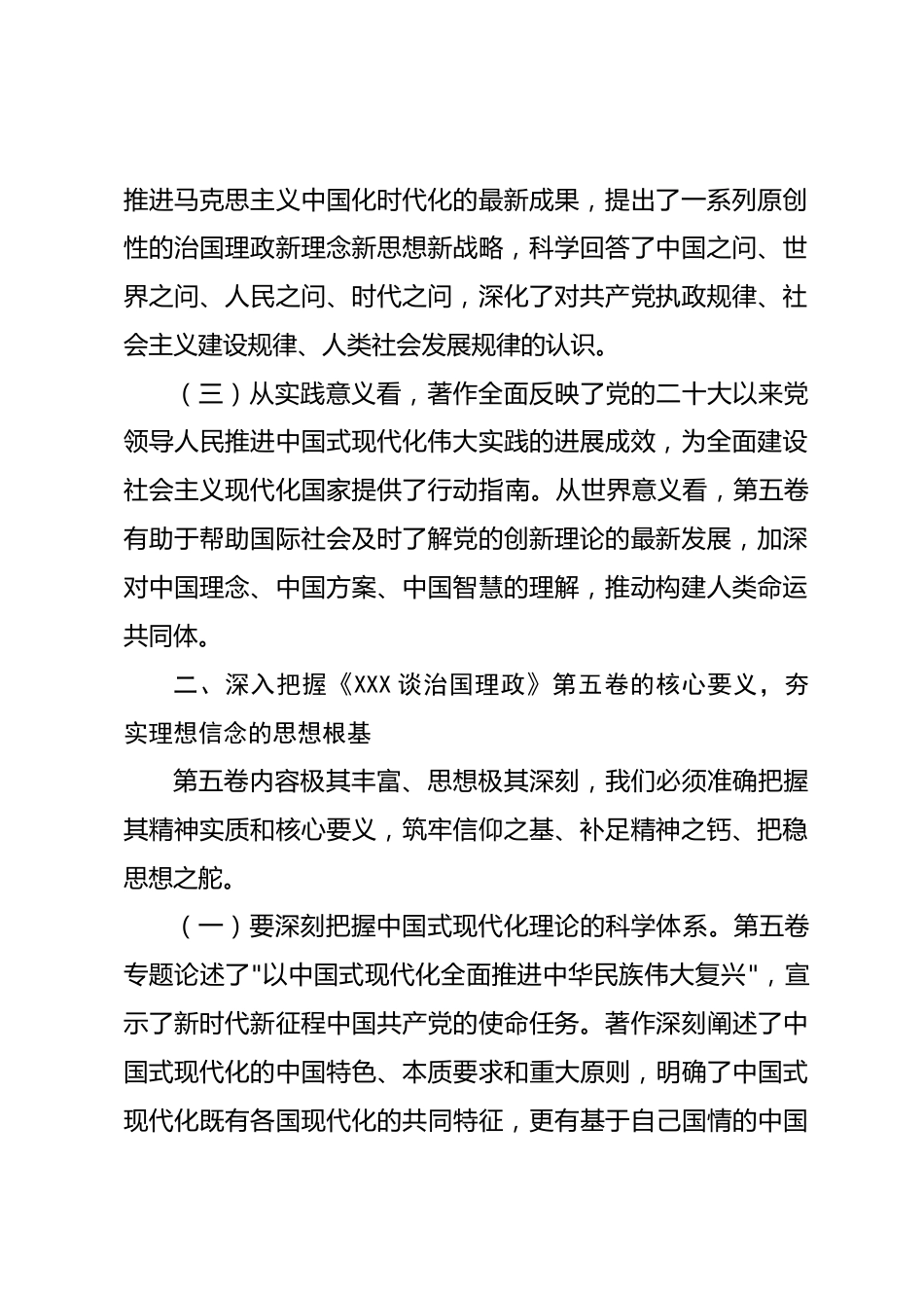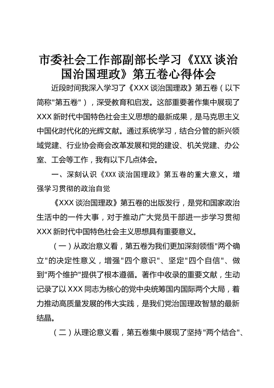 市委社會工作部副部長學(xué)習(xí)《XXX談治國治國理政》第五卷心得體會近段時間我深入學(xué)習(xí)了《XXX談治國理政》第五卷(以下簡稱"第五卷"),深受教育和啟發(fā)。這部重要著作集中展現(xiàn)了XXX新時代中國特色社會主義思想的最新成果,是馬克思主義中國化時代化的光輝文獻。通過系統(tǒng)學(xué)習(xí),結(jié)合分管的新興領(lǐng)域黨建、行業(yè)協(xié)會商會改革發(fā)展和黨的建設(shè)、機關(guān)黨建、辦公室、工會等工作,我有以下幾點體會。一、深刻認識《XXX談治國理政》第五卷的重大意義,增強學(xué)習(xí)貫徹的政治自覺《XXX談治國理政》第五卷的出版發(fā)行,是黨和國家政治生活中的一件大事,對于推動廣大黨員干部進一步學(xué)習(xí)貫徹XXX...