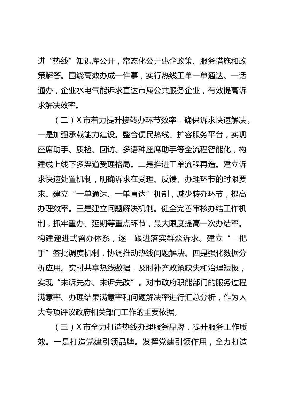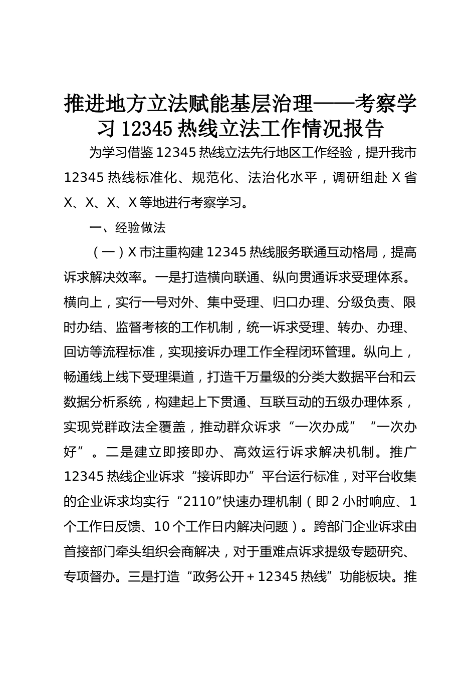 推進地方立法賦能基層治理——考察學習12345熱線立法工作情況報告為學習借鑒12345熱線立法先行地區(qū)工作經驗,提升我市12345熱線標準化、規(guī)范化、法治化水平,調研組赴X省X、X、X、X等地進行考察學習。一、經驗做法(一)X市注重構建12345熱線服務聯(lián)通互動格局,提高訴求解決效率。一是打造橫向聯(lián)通、縱向貫通訴求受理體系。橫向上,實行一號對外、集中受理、歸口辦理、分級負責、限時辦結、監(jiān)督考核的工作機制,統(tǒng)一訴求受理、轉辦、辦理、回訪等流程標準,實現(xiàn)接訴辦理工作全程閉環(huán)管理。縱向上,暢通線上線下受理渠道,打造千萬量級的分類大數(shù)據(jù)平臺和云數(shù)據(jù)分析系統(tǒng),...