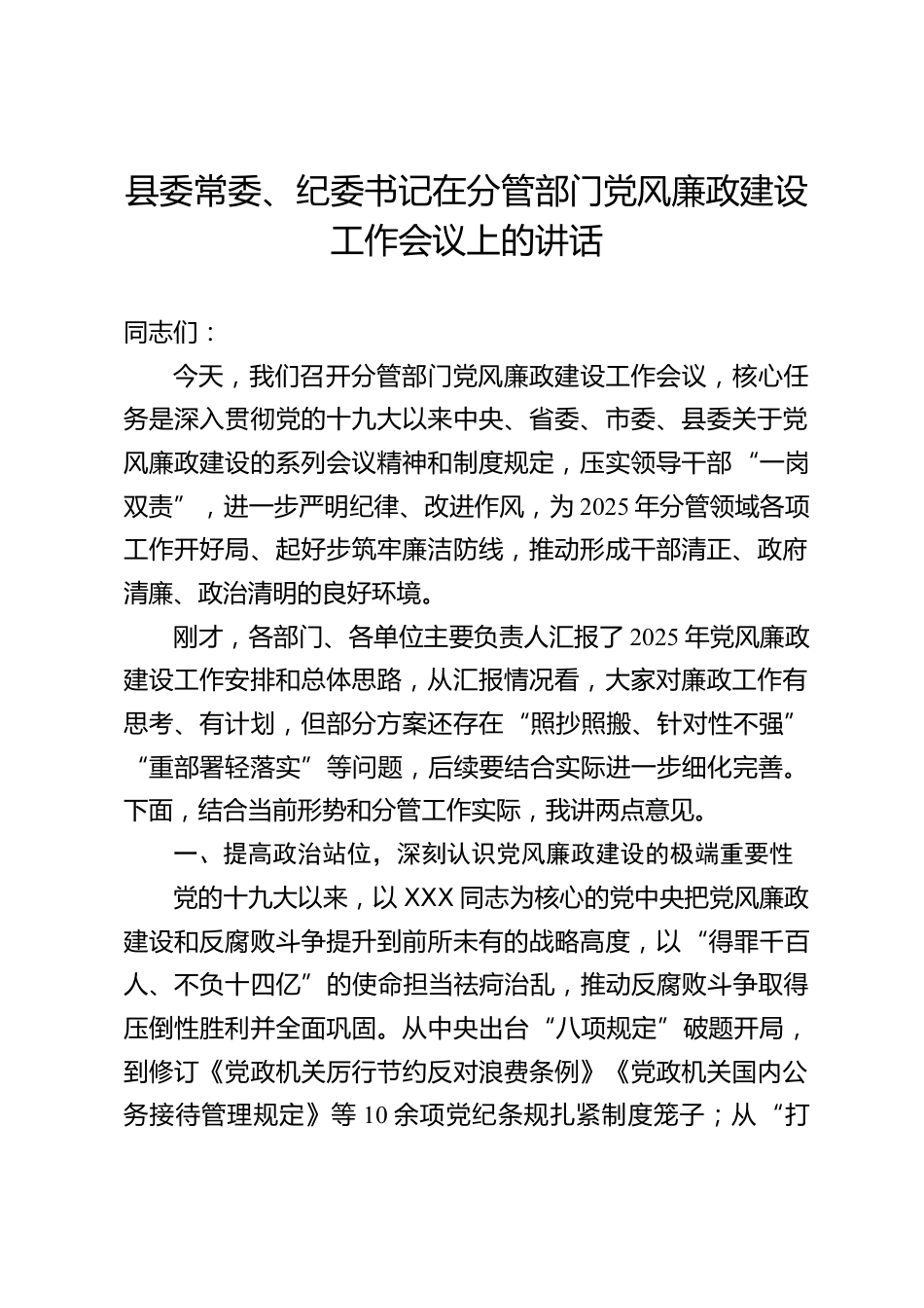 縣委常委、紀(jì)委書(shū)記在分管部門(mén)黨風(fēng)廉政建設(shè)工作會(huì)議上的講話同志們:今天,我們召開(kāi)分管部門(mén)黨風(fēng)廉政建設(shè)工作會(huì)議,核心任務(wù)是深入貫徹黨的十九大以來(lái)中央、省委、市委、縣委關(guān)于黨風(fēng)廉政建設(shè)的系列會(huì)議精神和制度規(guī)定,壓實(shí)領(lǐng)導(dǎo)干部“一崗雙責(zé)”,進(jìn)一步嚴(yán)明紀(jì)律、改進(jìn)作風(fēng),為2025年分管領(lǐng)域各項(xiàng)工作開(kāi)好局、起好步筑牢廉潔防線,推動(dòng)形成干部清正、政府清廉、政治清明的良好環(huán)境。剛才,各部門(mén)、各單位主要負(fù)責(zé)人匯報(bào)了2025年黨風(fēng)廉政建設(shè)工作安排和總體思路,從匯報(bào)情況看,大家對(duì)廉政工作有思考、有計(jì)劃,但部分方案還存在“照抄照搬、針對(duì)性不強(qiáng)”“重部署輕落實(shí)”...