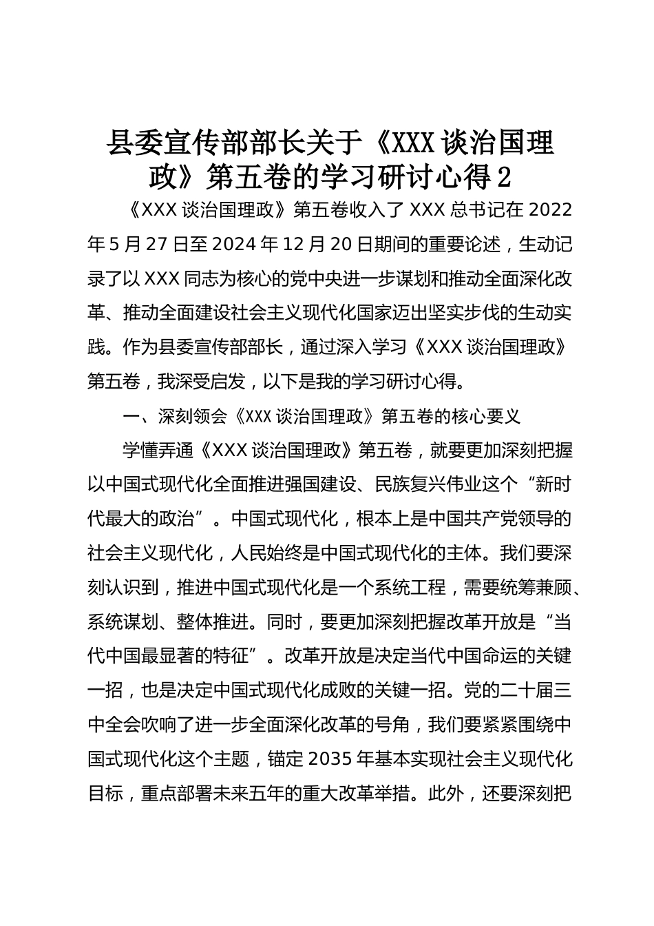 縣委宣傳部部長關于《XXX談治國理政》第五卷的學習研討心得2《XXX談治國理政》第五卷收入了XXX總書記在2022年5月27日至2024年12月20日期間的重要論述,生動記錄了以XXX同志為核心的黨中央進一步謀劃和推動全面深化改革、推動全面建設社會主義現(xiàn)代化國家邁出堅實步伐的生動實踐。作為縣委宣傳部部長,通過深入學習《XXX談治國理政》第五卷,我深受啟發(fā),以下是我的學習研討心得。一、深刻領會《XXX談治國理政》第五卷的核心要義學懂弄通《XXX談治國理政》第五卷,就要更加深刻把握以中國式現(xiàn)代化全面推進強國建設、民族復興偉業(yè)這個“新時代最大的政治”。中國式現(xiàn)代化,...