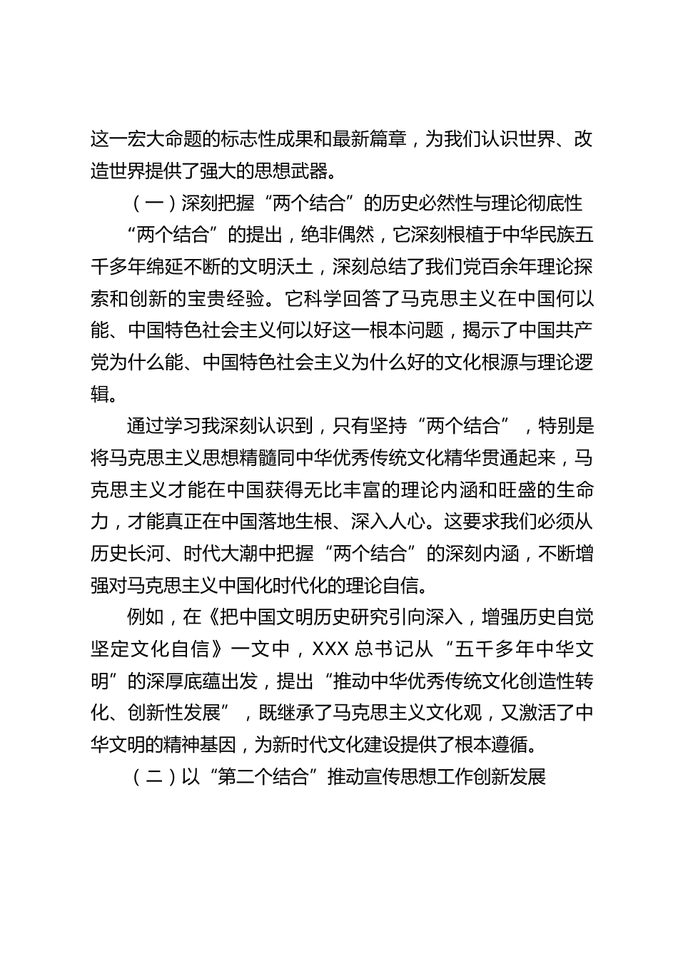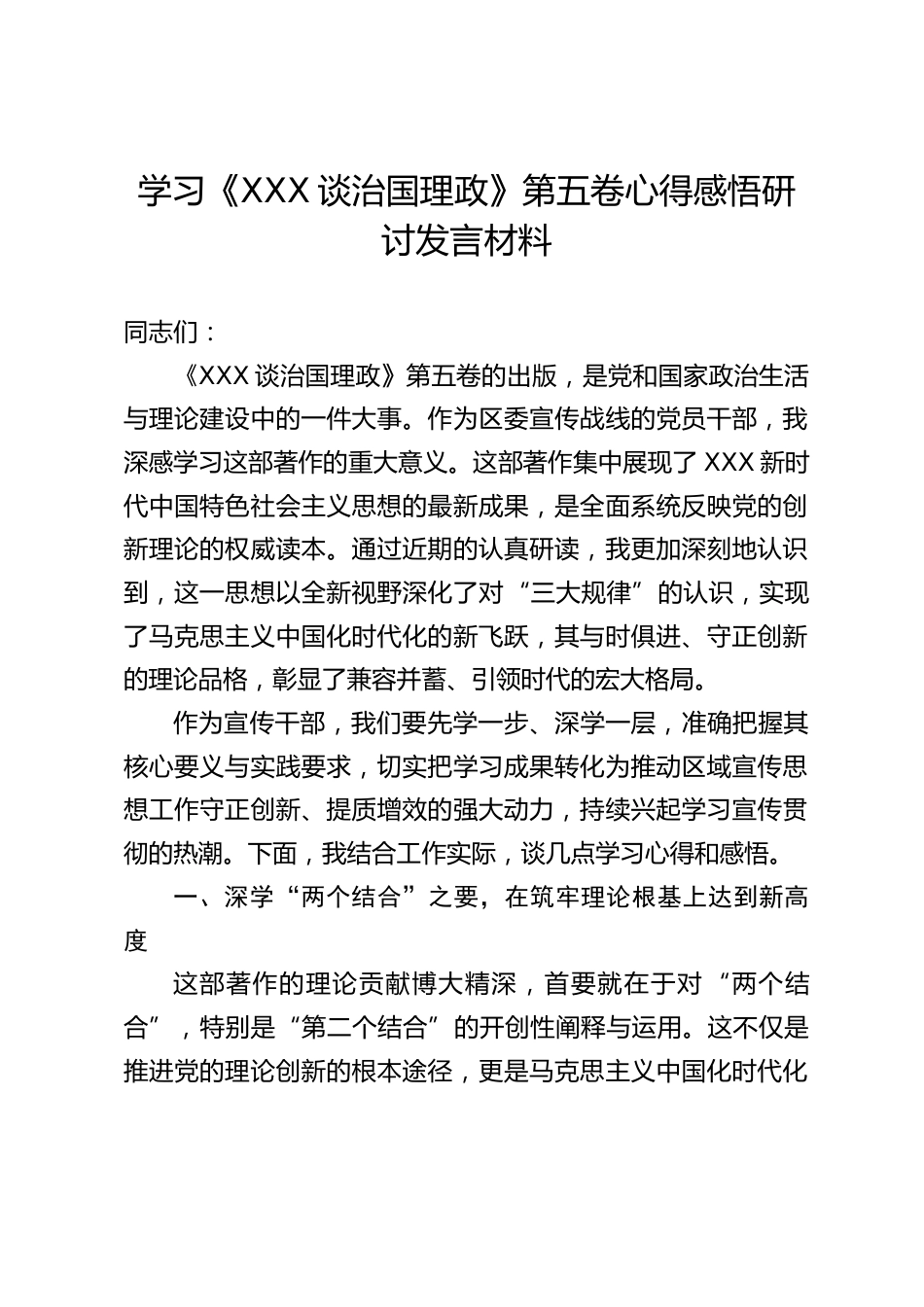 學習《XXX談治國理政》第五卷心得感悟研討發(fā)言材料同志們:《XXX談治國理政》第五卷的出版,是黨和國家政治生活與理論建設(shè)中的一件大事。作為區(qū)委宣傳戰(zhàn)線的黨員干部,我深感學習這部著作的重大意義。這部著作集中展現(xiàn)了XXX新時代中國特色社會主義思想的最新成果,是全面系統(tǒng)反映黨的創(chuàng)新理論的權(quán)威讀本。通過近期的認真研讀,我更加深刻地認識到,這一思想以全新視野深化了對“三大規(guī)律”的認識,實現(xiàn)了馬克思主義中國化時代化的新飛躍,其與時俱進、守正創(chuàng)新的理論品格,彰顯了兼容并蓄、引領(lǐng)時代的宏大格局。作為宣傳干部,我們要先學一步、深學一層,準確把握其核心...