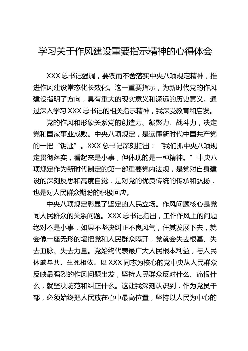 學(xué)習(xí)關(guān)于作風(fēng)建設(shè)重要指示精神的心得體會XXX總書記強(qiáng)調(diào),要鍥而不舍落實(shí)中央八項(xiàng)規(guī)定精神,推進(jìn)作風(fēng)建設(shè)常態(tài)化長效化。這一重要指示,為新時(shí)代黨的作風(fēng)建設(shè)指明了方向,具有重大的現(xiàn)實(shí)意義和深遠(yuǎn)的歷史意義。通過深入學(xué)習(xí)XXX總書記的相關(guān)指示精神,我深受教育和啟發(fā)。黨的作風(fēng)和形象關(guān)系黨的創(chuàng)造力、凝聚力、戰(zhàn)斗力,決定黨和國家事業(yè)成敗。中央八項(xiàng)規(guī)定,是讀懂新時(shí)代中國共產(chǎn)黨的一把“鑰匙”。XXX總書記深刻指出:“我們抓中央八項(xiàng)規(guī)定貫徹落實(shí),看起來是小事,但體現(xiàn)的是一種精神。”中央八項(xiàng)規(guī)定作為新時(shí)代制定的第一部重要黨內(nèi)法規(guī),是黨對自身建設(shè)的深刻反思和高...