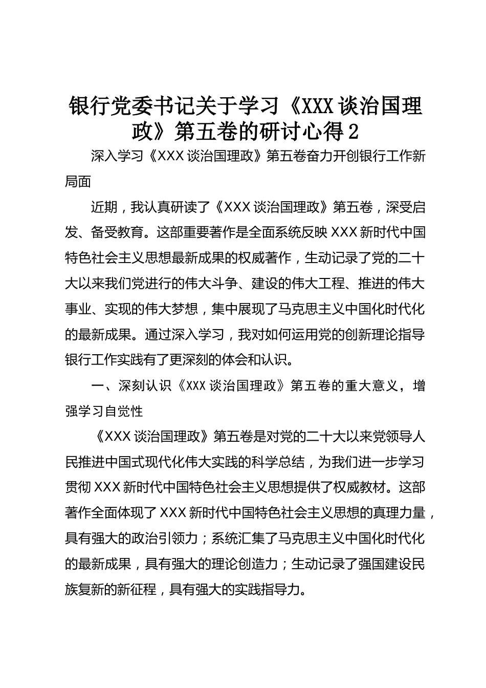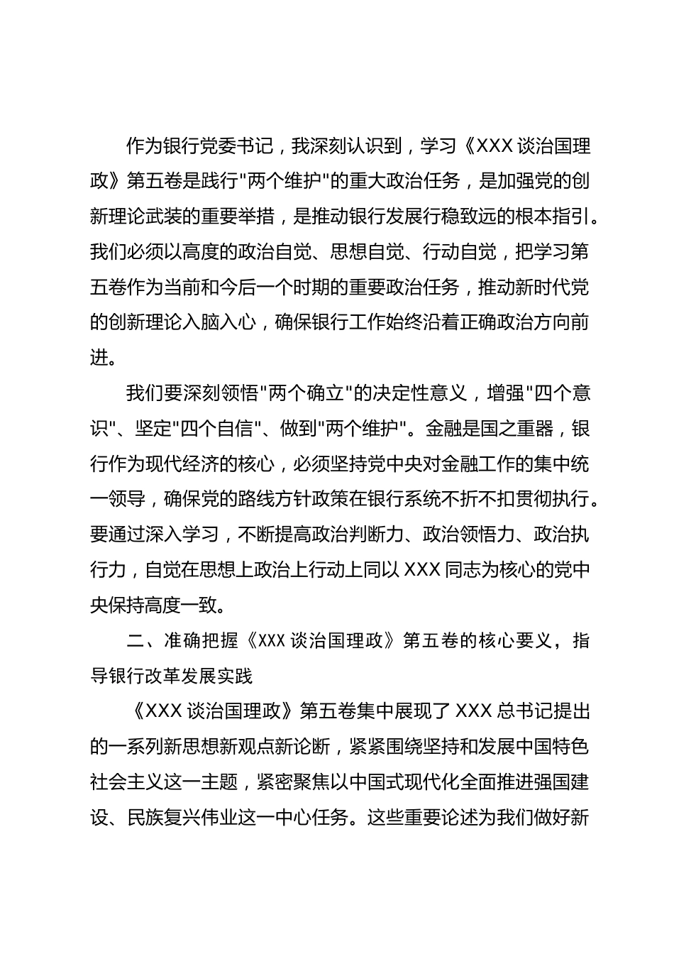 銀行黨委書(shū)記關(guān)于學(xué)習(xí)《XXX談治國(guó)理政》第五卷的研討心得2深入學(xué)習(xí)《XXX談治國(guó)理政》第五卷奮力開(kāi)創(chuàng)銀行工作新局面近期,我認(rèn)真研讀了《XXX談治國(guó)理政》第五卷,深受啟發(fā)、備受教育。這部重要著作是全面系統(tǒng)反映XXX新時(shí)代中國(guó)特色社會(huì)主義思想最新成果的權(quán)威著作,生動(dòng)記錄了黨的二十大以來(lái)我們黨進(jìn)行的偉大斗爭(zhēng)、建設(shè)的偉大工程、推進(jìn)的偉大事業(yè)、實(shí)現(xiàn)的偉大夢(mèng)想,集中展現(xiàn)了馬克思主義中國(guó)化時(shí)代化的最新成果。通過(guò)深入學(xué)習(xí),我對(duì)如何運(yùn)用黨的創(chuàng)新理論指導(dǎo)銀行工作實(shí)踐有了更深刻的體會(huì)和認(rèn)識(shí)。一、深刻認(rèn)識(shí)《XXX談治國(guó)理政》第五卷的重大意義,增強(qiáng)學(xué)習(xí)自覺(jué)性《XXX談...
