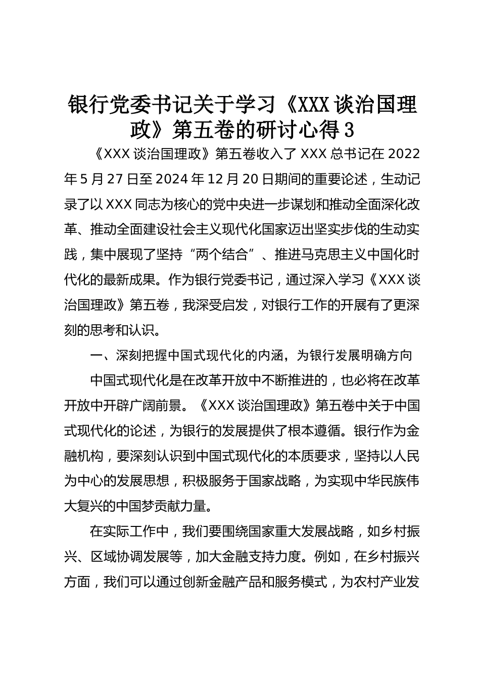 銀行黨委書(shū)記關(guān)于學(xué)習(xí)《XXX談治國(guó)理政》第五卷的研討心得3《XXX談治國(guó)理政》第五卷收入了XXX總書(shū)記在2022年5月27日至2024年12月20日期間的重要論述,生動(dòng)記錄了以XXX同志為核心的黨中央進(jìn)一步謀劃和推動(dòng)全面深化改革、推動(dòng)全面建設(shè)社會(huì)主義現(xiàn)代化國(guó)家邁出堅(jiān)實(shí)步伐的生動(dòng)實(shí)踐,集中展現(xiàn)了堅(jiān)持“兩個(gè)結(jié)合”、推進(jìn)馬克思主義中國(guó)化時(shí)代化的最新成果。作為銀行黨委書(shū)記,通過(guò)深入學(xué)習(xí)《XXX談治國(guó)理政》第五卷,我深受啟發(fā),對(duì)銀行工作的開(kāi)展有了更深刻的思考和認(rèn)識(shí)。一、深刻把握中國(guó)式現(xiàn)代化的內(nèi)涵,為銀行發(fā)展明確方向中國(guó)式現(xiàn)代化是在改革開(kāi)放中不斷推進(jìn)的,也必將在改革...