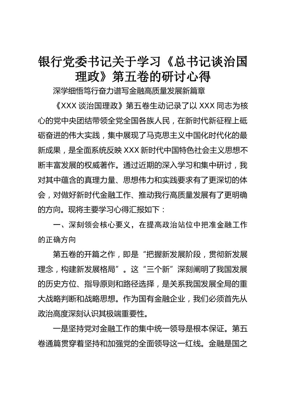 銀行黨委書記關于學習《總書記談治國理政》第五卷的研討心得深學細悟篤行奮力譜寫金融高質(zhì)量發(fā)展新篇章《XXX談治國理政》第五卷生動記錄了以XXX同志為核心的黨中央團結(jié)帶領全黨全國各族人民,在新時代新征程上砥礪奮進的偉大實踐,集中展現(xiàn)了馬克思主義中國化時代化的最新成果,是全面系統(tǒng)反映XXX新時代中國特色社會主義思想不斷豐富發(fā)展的權(quán)威著作。通過近期的深入學習和集中研討,我對其中蘊含的真理力量、思想偉力和實踐要求有了更深切的體會,對做好新時代金融工作、推動我行高質(zhì)量發(fā)展有了更明確的方向?,F(xiàn)將主要學習心得匯報如下:一、深刻領會核心要義,在提高政...