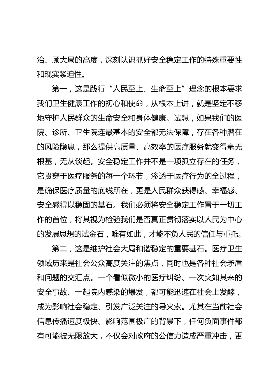 在2025年全區(qū)衛(wèi)生健康系統(tǒng)安全穩(wěn)定工作會(huì)議上的講話同志們:今天,我們?cè)谶@里召開全區(qū)衛(wèi)生健康系統(tǒng)安全穩(wěn)定工作會(huì)議,主要任務(wù)是深入貫徹落實(shí)近期省、市、區(qū)關(guān)于安全穩(wěn)定工作的一系列重要指示精神,分析研判當(dāng)前我區(qū)衛(wèi)生健康領(lǐng)域面臨的形勢(shì)和挑戰(zhàn),安排部署下一階段的重點(diǎn)工作。剛才,會(huì)議已經(jīng)傳達(dá)了上級(jí)的有關(guān)會(huì)議和文件精神,通報(bào)了近期督查發(fā)現(xiàn)的一些問題和典型案例,希望大家務(wù)必引以為戒,警鐘長(zhǎng)鳴。當(dāng)前,我們正處在一個(gè)關(guān)鍵時(shí)期,各項(xiàng)事業(yè)發(fā)展進(jìn)入攻堅(jiān)階段,特別是即將迎來(lái)重要的紀(jì)念活動(dòng),營(yíng)造一個(gè)安全、穩(wěn)定、和諧的社會(huì)環(huán)境,是我們必須肩負(fù)起的重大政治責(zé)任。...